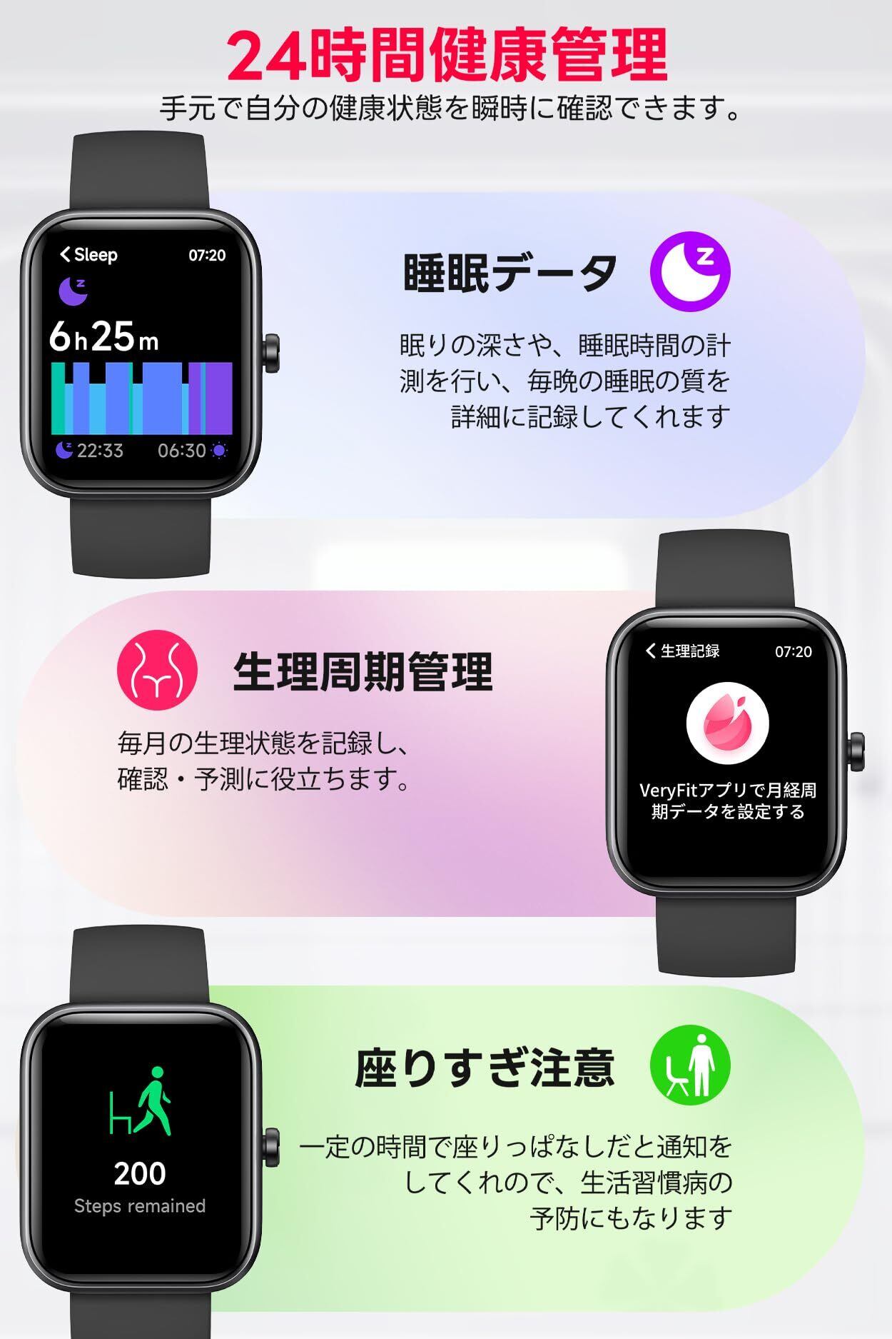 【適応デバイス&日本語アプリ&安心】smart watch はAndroid 6.0、iOS9.0、及びBluetooth 4.0以上に対応しています。日本語アプリは、専用APP「VeryFit」と同期させると、詳しいデータが日別に確認できる。購入日からのメーカーを提供します。本商品についてご不明な点がございましたら、お気軽にご連絡ください。24時間以内に返事します。