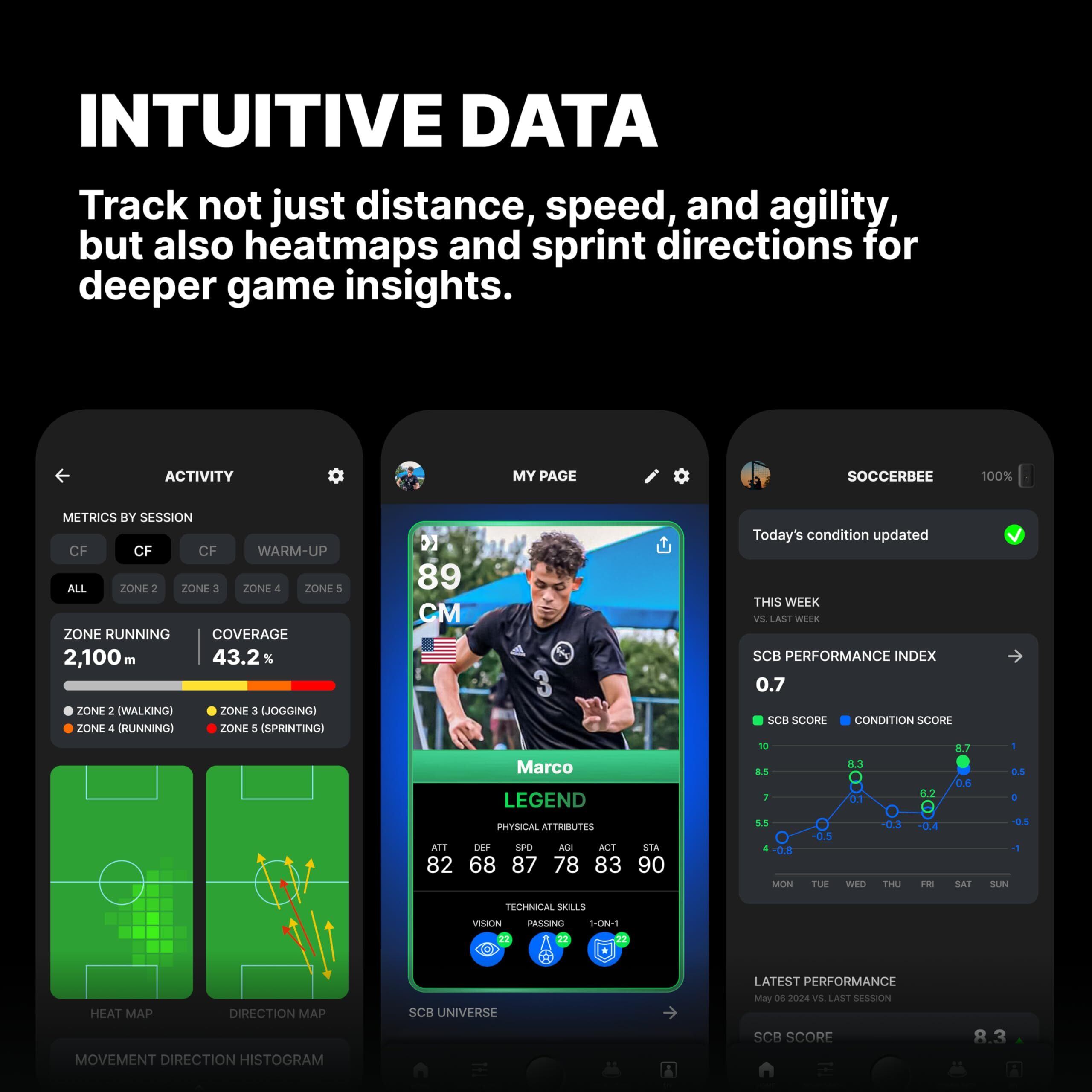 特別機能: 過去3ヶ月のデータに基づいたポジション別の総合サッカー能力評価、各指標の月別およびシーズン別トレンドグラフ、グローバル比較のための月間リーダーボード、チームメイトや対戦相手(Soccerbee使用者)とのリアルタイム比較が可能な試合ごとのリーダーボード