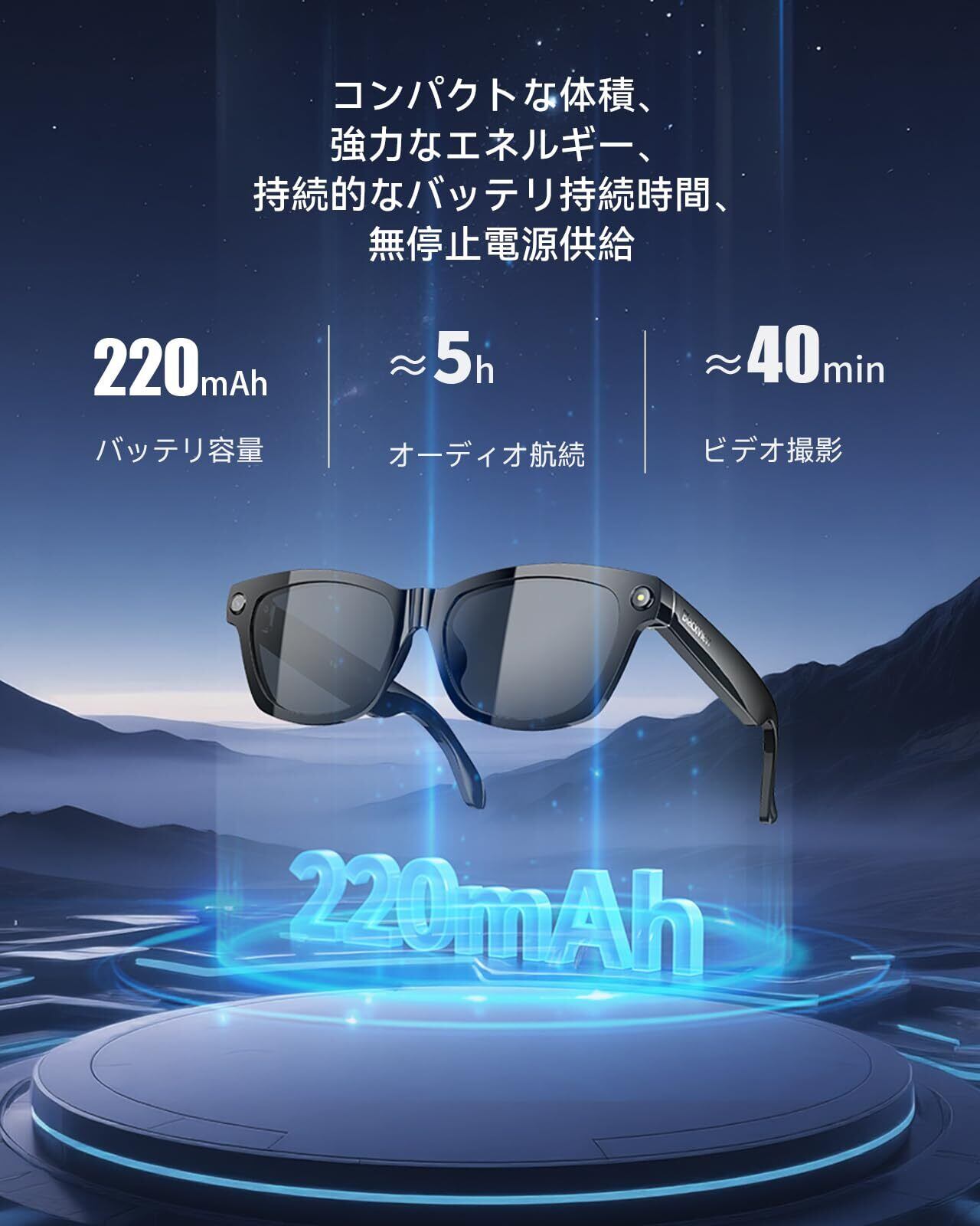 【開放式骨伝導型オーディオグラスと金属タッチ+本体ボタン】骨伝導オーディオメガネ、開放式装着、両耳解放、スマートグラス純重量わずか45.7g、全天候快適装着、聴く楽しみを満喫!HiFiレベルの音質で、クリアに聴くことができ、通話と聴取モードを自由に切り替えることができます。ミラー脚の両側にある金属タッチボタンは音楽モードと音量を調節することができ、ミラー脚の両側の上にある本体ボタンは写真撮影/録画/録音/電話切断/AIウェイクアップなどの機能を制御することができます。220mAh大容量バッテリー、2ピン磁気吸引Type-C急速充電、急速充電をサポート、充電電流帯経路管理300mAh。日常待機23H、音楽を聴く時間は5H、連続録画は40分、満充電は1Hしかかかります。