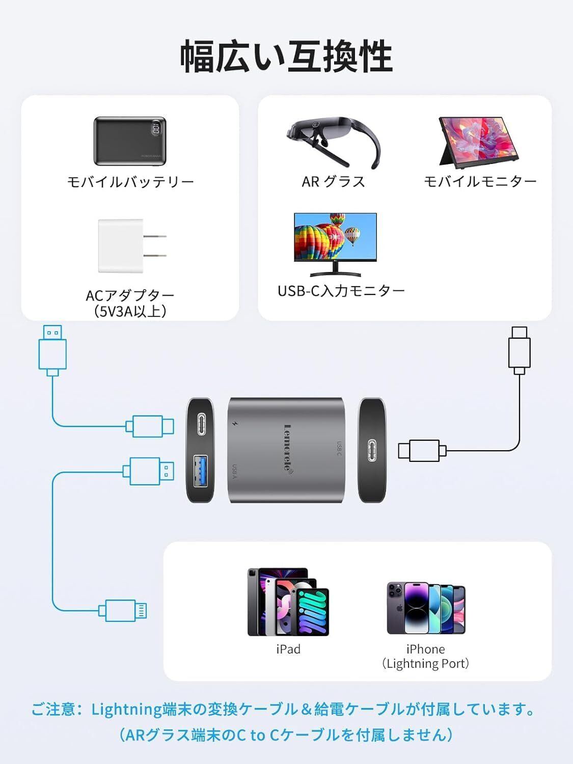 スマートグラス iphone 14以前対応 変換アダプター Lightning to XREAL One/USB-C モニター Lemorele ライトニング to Xreal/VITURE One/Rokid Air max/TCL nxtwear s/RayNeo プラグアンドプレイ ケーブル付 スマートメガネ