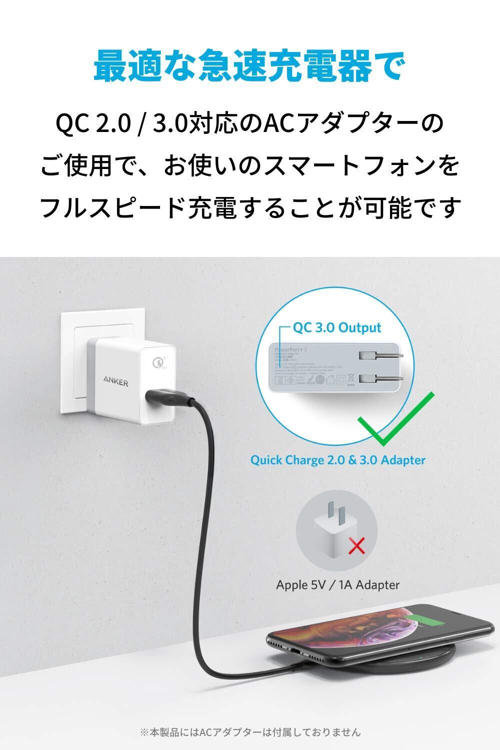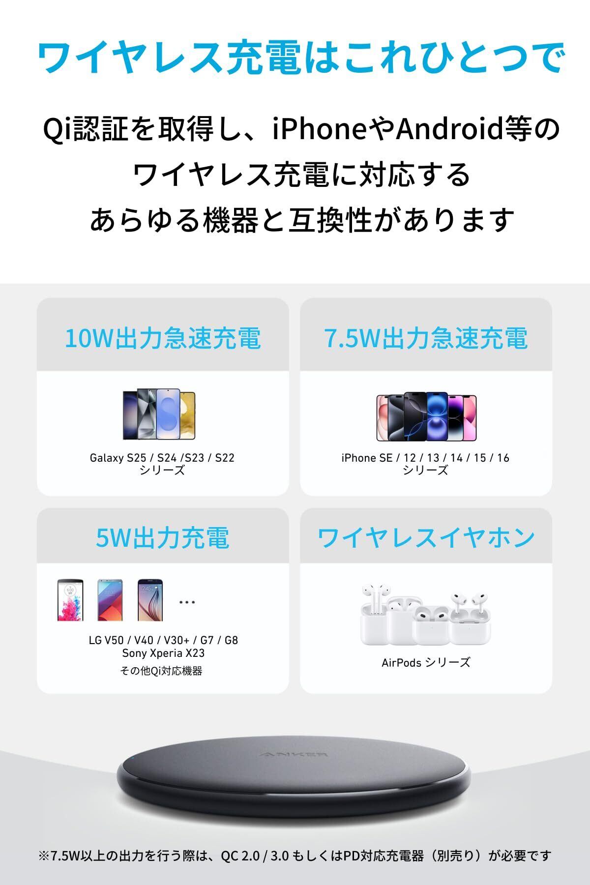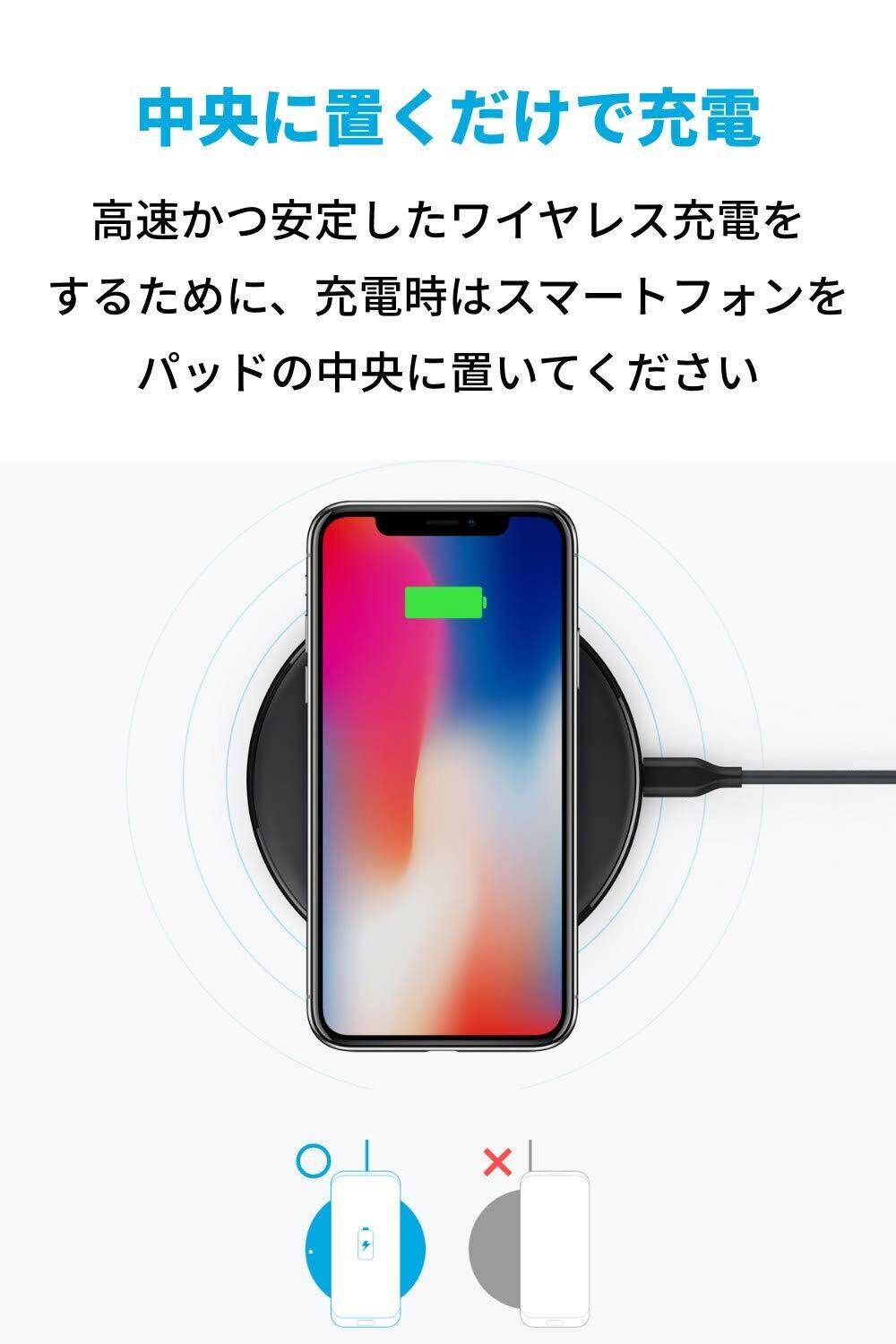 便利なワイヤレス充電を:充電効率を高め、iPhoneへは7.5W出力充電が可能です。また、Galaxyへ10W出力による充電を実現しました (※ iPhone12の場合、約3時間半で満充電可能です) (※ 本製品はApple製スマートフォンに付属の充電器 (5V/1A出力) およびパソコンのUSBポートに対応していません。「Anker PowerPort+ 1」など、5V/2A以上のACアダプタをご使用ください)。