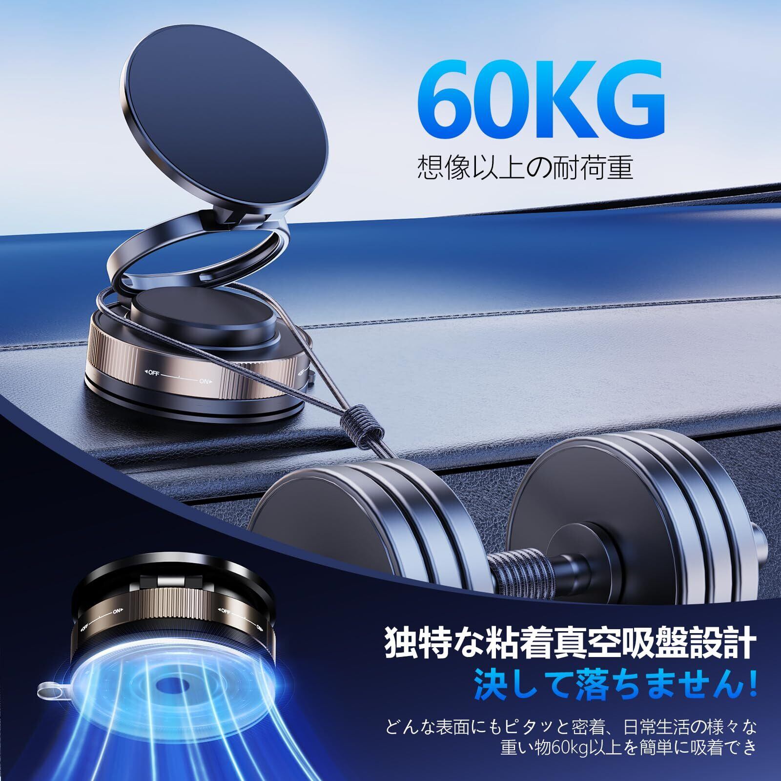 【革新的設計!磁力&真空ゲル吸盤の車載ホルダー】業界最強となる12基のN55磁石を採用し、吸着力は従来品の20倍以上!最大5kgの保持力を実現し、これは大体iPhone 16 Pro Max 20台分に相当します。保護機能により使用途切れの心配もなく、真空ゲル吸盤と超強力磁石の組み合わせで、あらゆる路況下でも確実に固定。効率的な車用で利便性を向上させます。