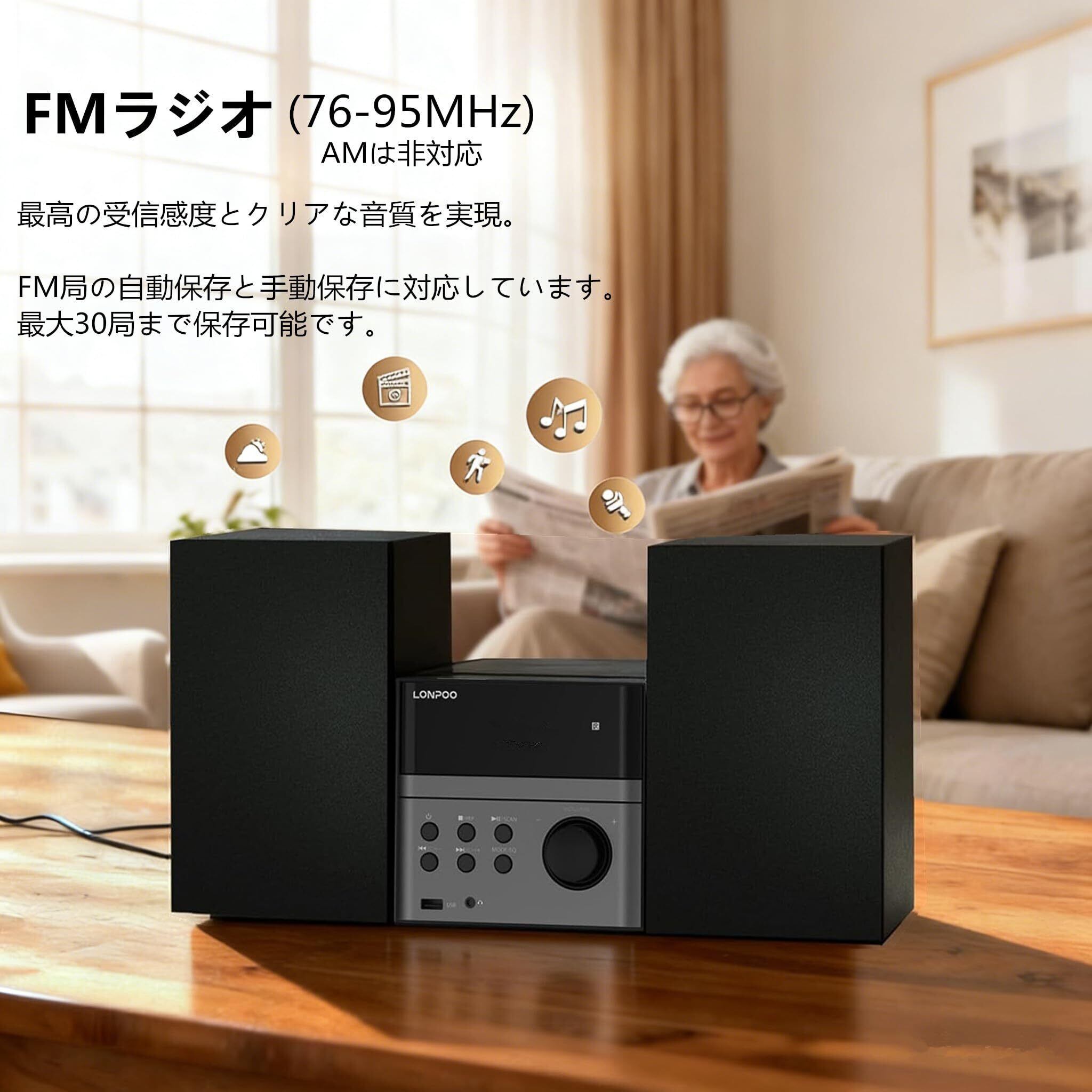 【多機能】●1.CDを聴く:CD/CD-R/CD-RW/MP3 ●2.ラジオを聴く:FM放送の受信(76.0 MHz~95.0 MHz,AMは非対応) ,スキャンされた局は順にメモリーされます(最大30局) ●3.Bluetoothを接続する:デバイス(電話、タブレット、コンピューターなど)をCDプレーヤーに接続します (Bluetoothイヤホンはサポートされていません) ●4.USBでMP3を聴く(最大64GB):MP3/WMA ●5. AUX IN:デバイス(電話、コンピューターなど)をCDプレーヤーに接続します(デバイスに3.5mmジャックがあることを確認してください,これは通常、ほとんどのデバイスのイヤホンジャックです) ●6.ヘッドホンで聴く(3.5mm)。