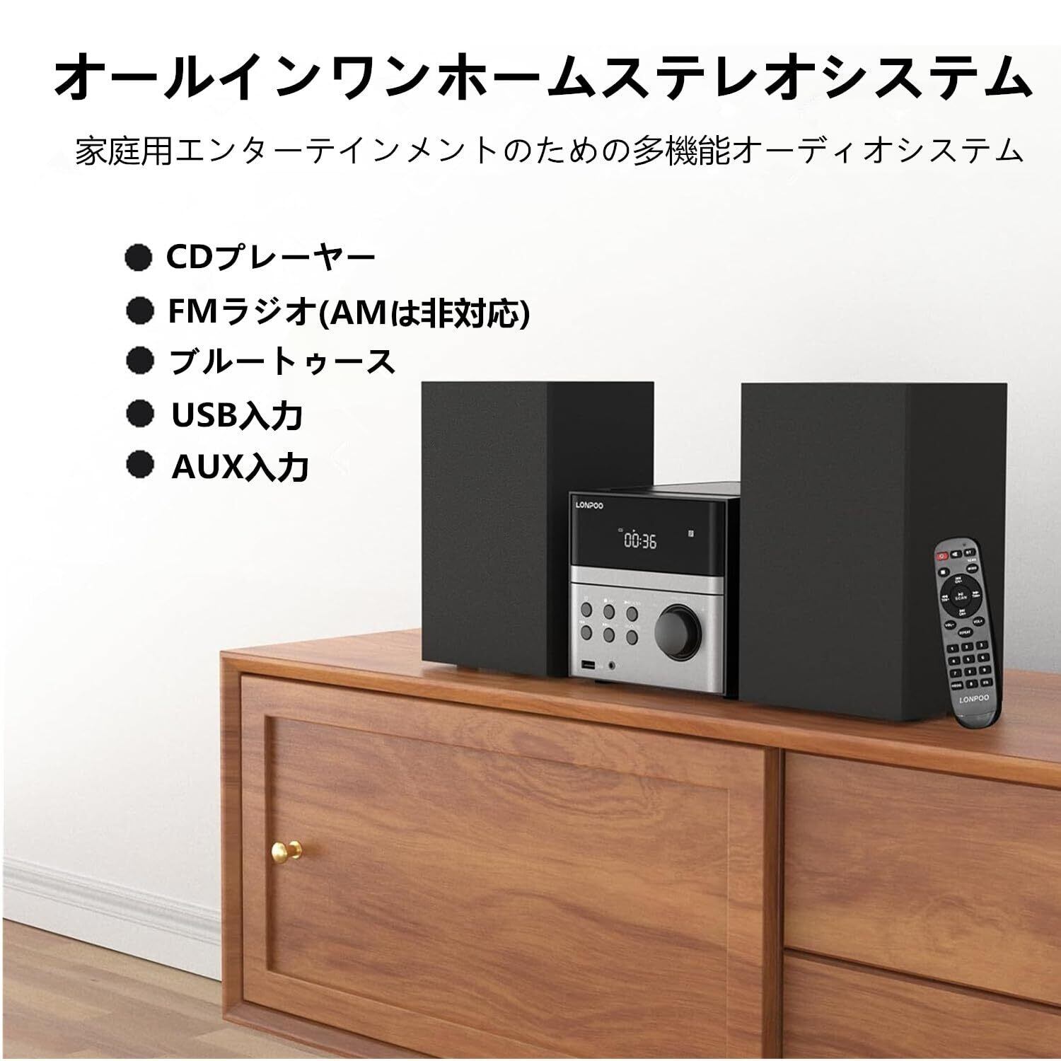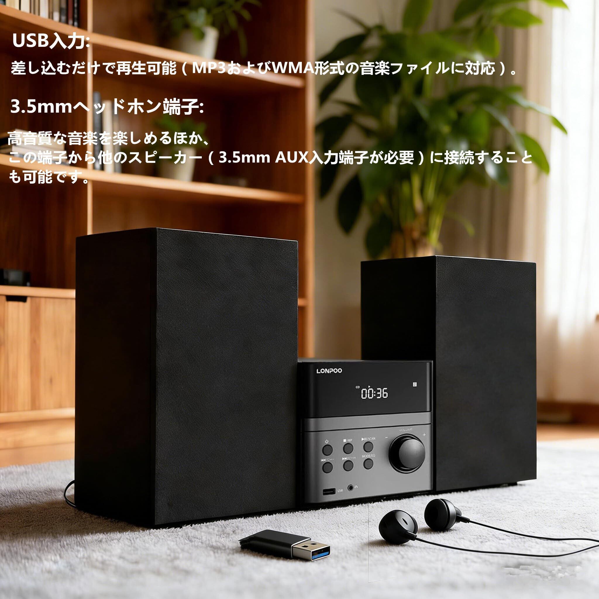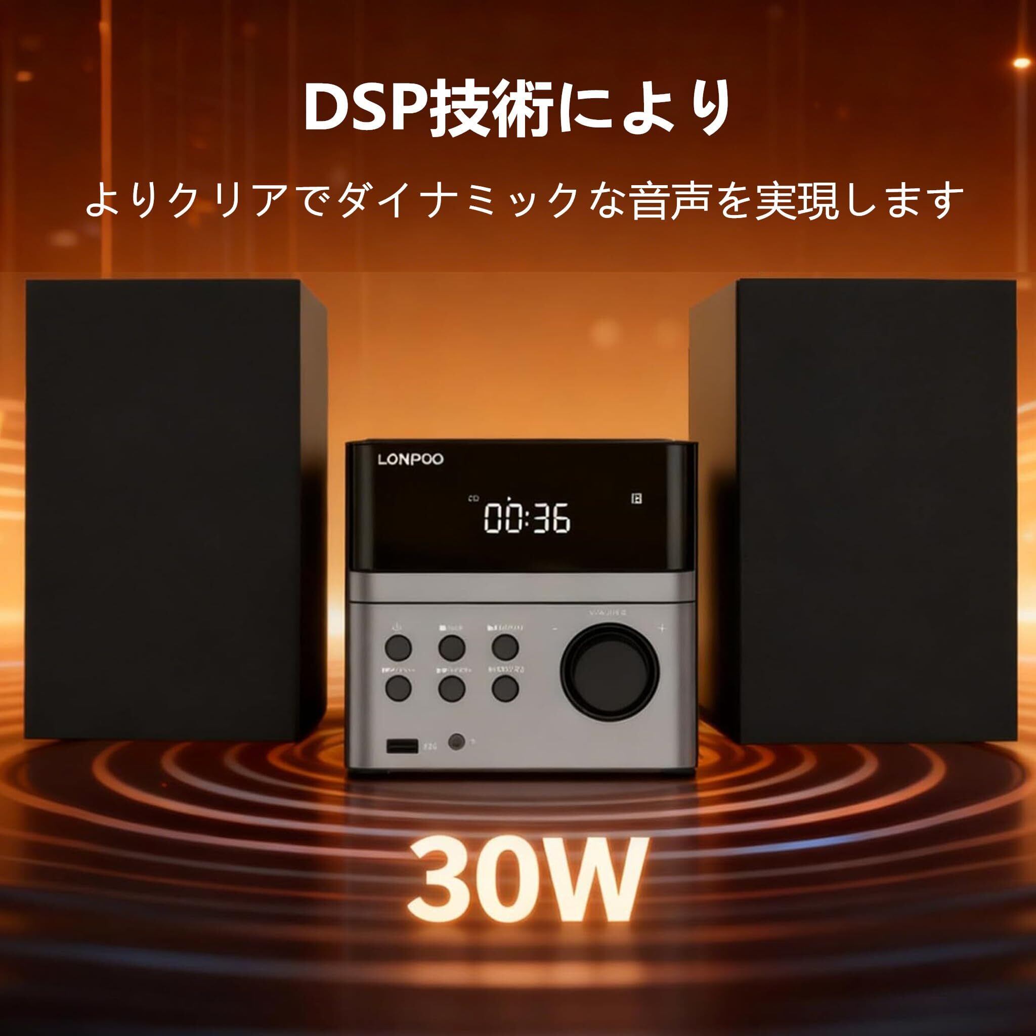 実用最大出力合計値30Wの高音質再生します:15W+15W, 高音域と正確なイメージングを実現する高性能シルクツイーター, パワフルでトランジェントな低音を実現するバランスの取れた編組カーボンファイバーウーファー。選べる5種類の音質を提供: flat/jazz/rock/pop/classic(フラット / ジャズ / ロック / ポップ / クラシック),低音がお好みの場合は「Rock」モードを選択でき、よりソフトな音が好みの場合は「Jazz」モードを選択できます。シンプルで気品のあるコンパクトデザインです,機械のボタンとリモコンは日本語です, CDやスマートフォンの音楽が楽しめる使いやすいシンプル操作できます。