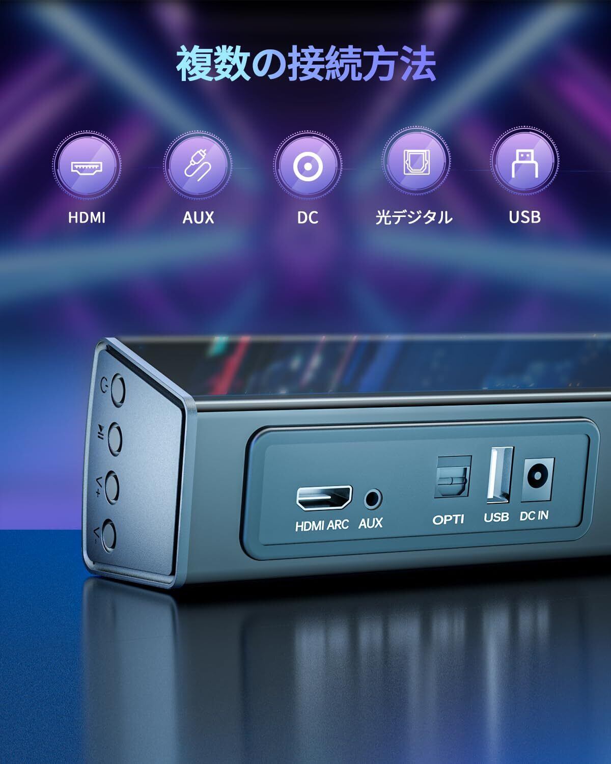 【便利で多機能なサウンドバー】 このサウンドバーはARC対応で、ARC対応のテレビと接続することで、テレビと 電源ON/OFFが連動 し、音量調整もテレビリモコンから操作可能 です。また、Bluetoothを搭載し、スマートフォン、パソコンなどのデバイスと簡単にペアリング可能です。ワイヤレスで快適に音楽を楽しむことができ、ケーブルの煩わしさから解放されます。さらに、光ケーブル、AUXケーブルを使ってテレビにも接続可能です。(使用前に、電源アダプターでの給電が必要 です。)