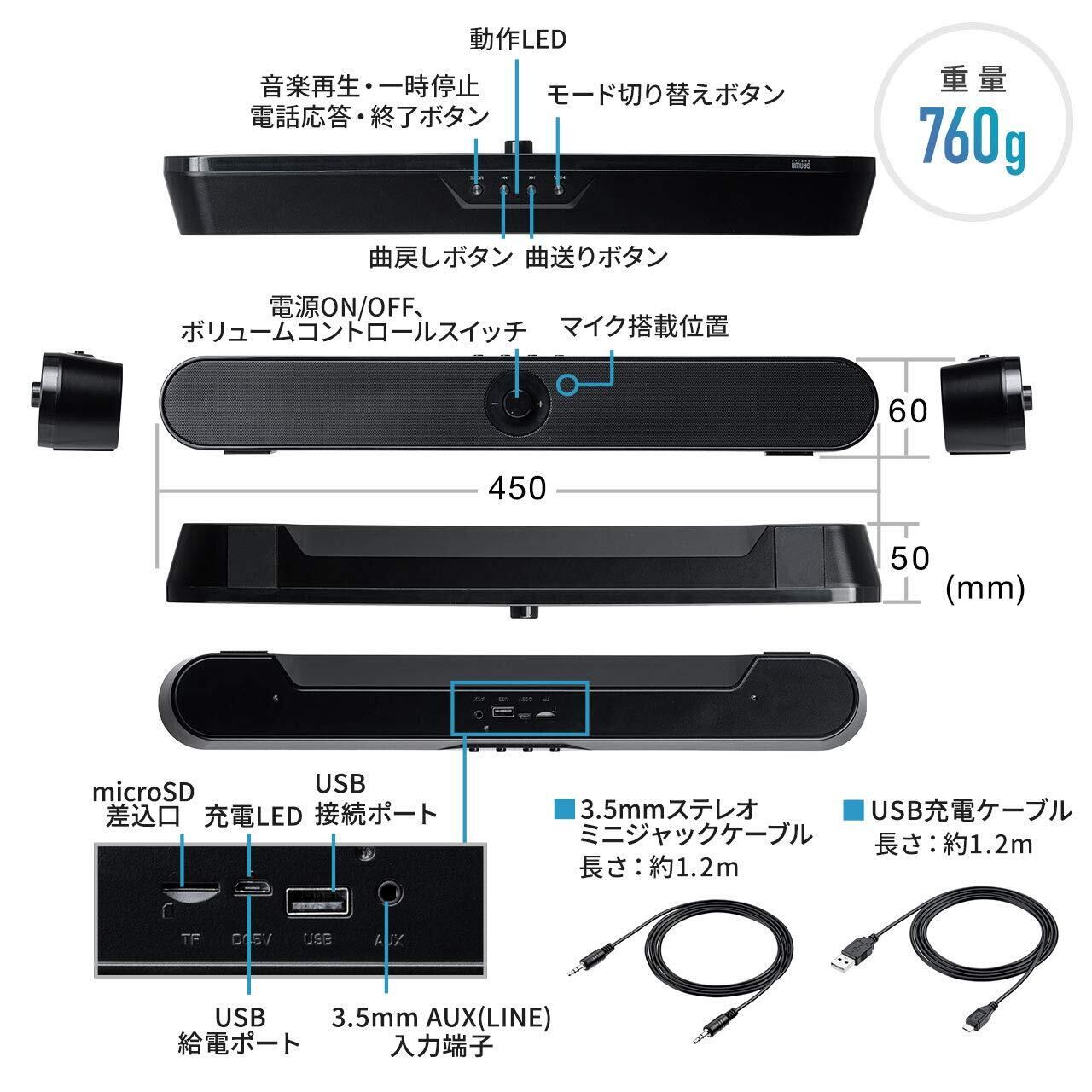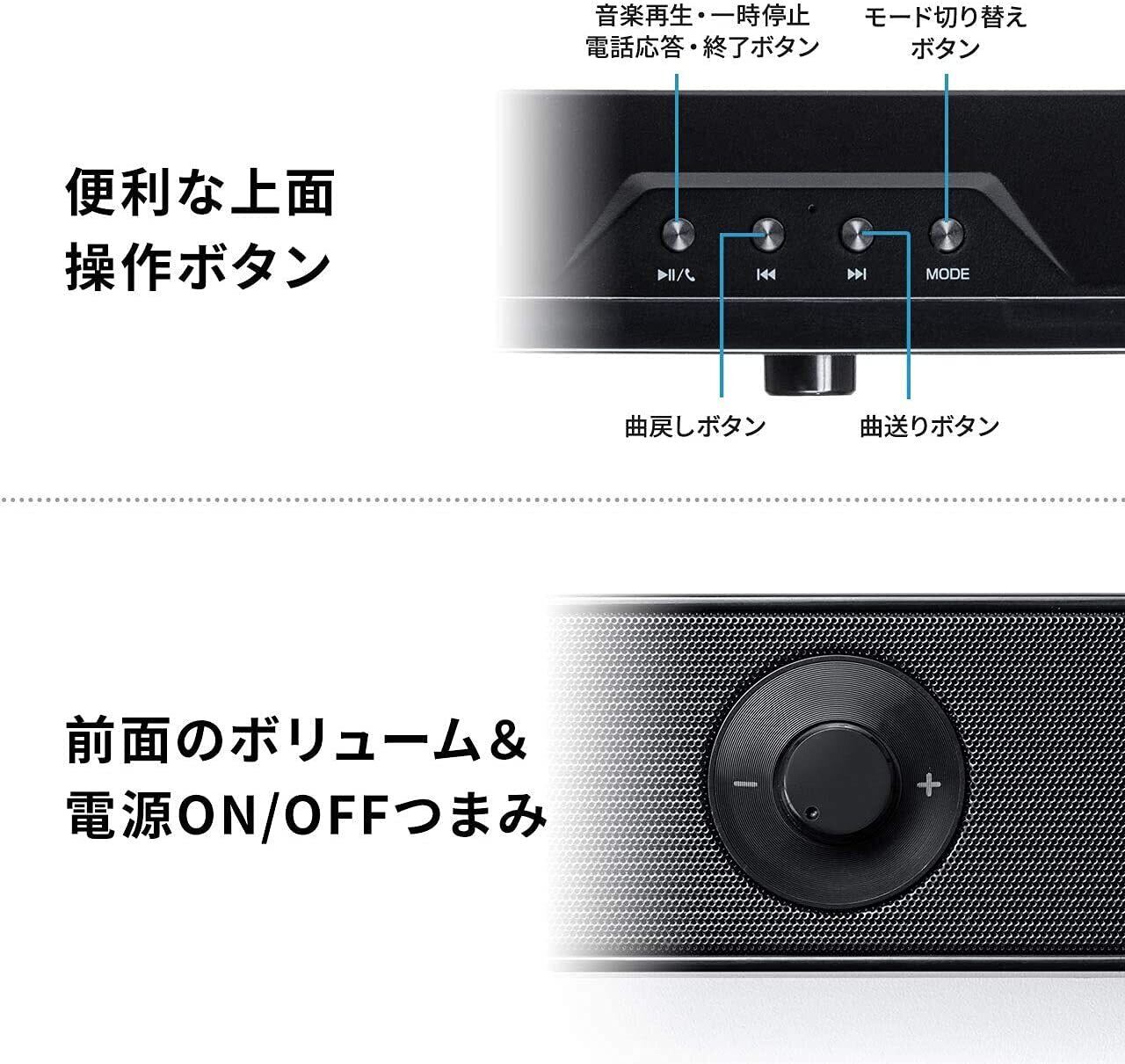 サンワダイレクト サウンドバー 幅45cm 20W Bluetooth/有線 3.5mm / microSD・USBメモリ 充電式 パッシブラジエーター搭載 PCスピーカー 1個 400-SP092
