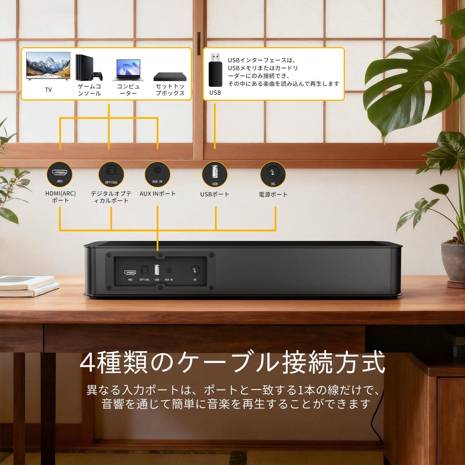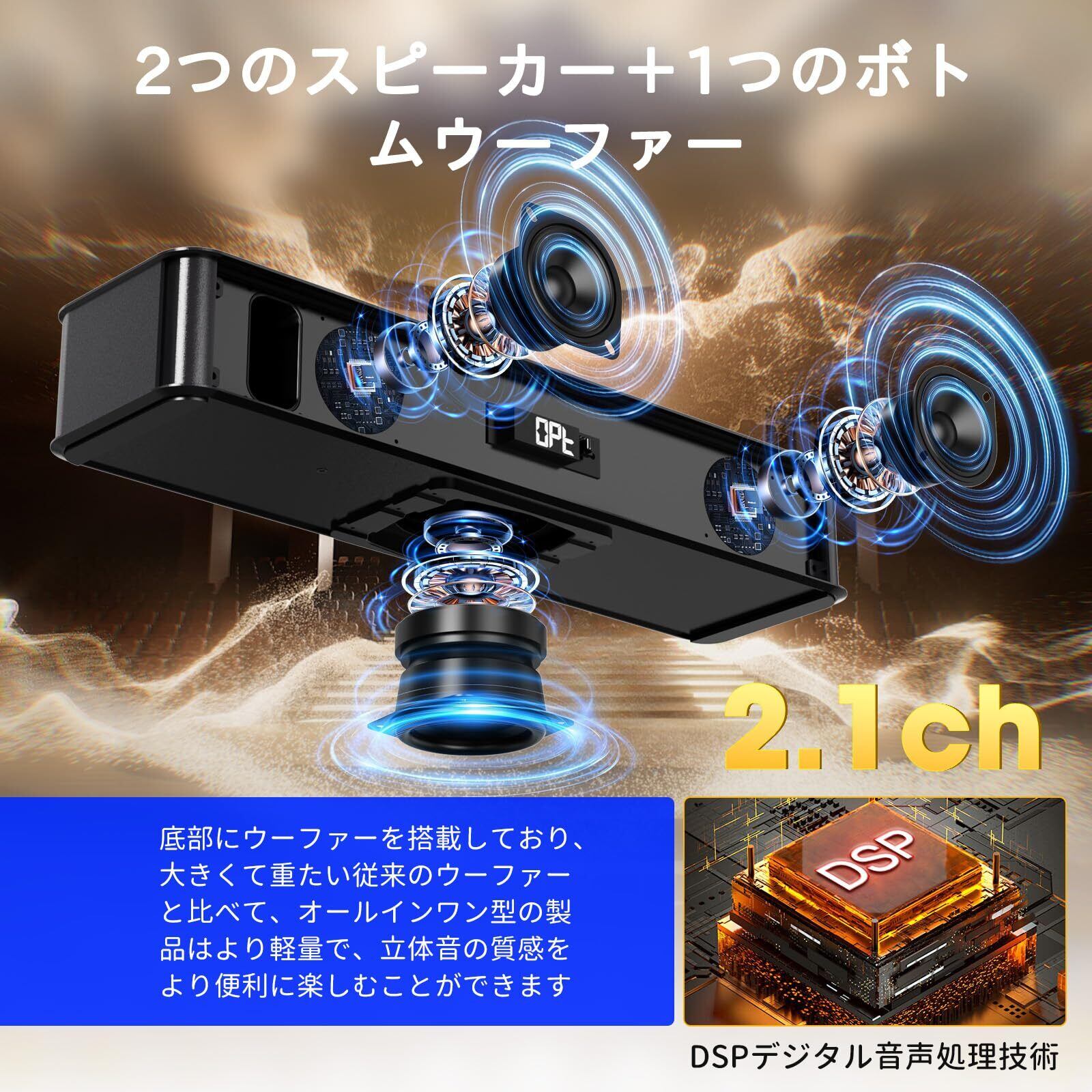 【複数の接続方法】:テレビサウンドバーは、Bluetooth、オプティカルケーブル、AUXケーブル、HDMI(ARC)ケーブル、USB接続による音楽再生に対応しています。最新のBluetooth 5.3技術を搭載し、スマートフォンやパソコンなどのデバイスとのゼロ遅延のワイヤレス接続が可能です。