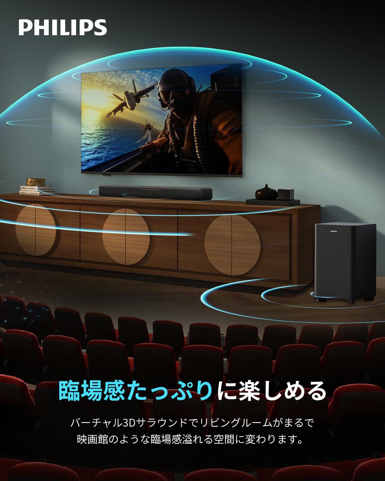 【映画館のような没入型サウンド】:PHILIPS サウンドバーは2つのユニットを内蔵で、バイネルスピーカーはステレオ効果を生み出し、空間に音楽のサラウンド分布を感じることができます。音楽をよりダイナミックに、思いのままに楽しむことができます。DTS Virtual:Xは広い3Dサラウンドサウンドを創造し、前面、左側、右側とサラウンドサウンドに高さを加え、より広く、より高く、より没入的なサウンド体験をお楽しみいただけます。雨や落雷、空中を旋回するヘリコプターなど頭上からのサウンドも的確に再現することで、アクション映画の視聴やテレビゲームのプレイに圧倒的な臨場感を与えます。