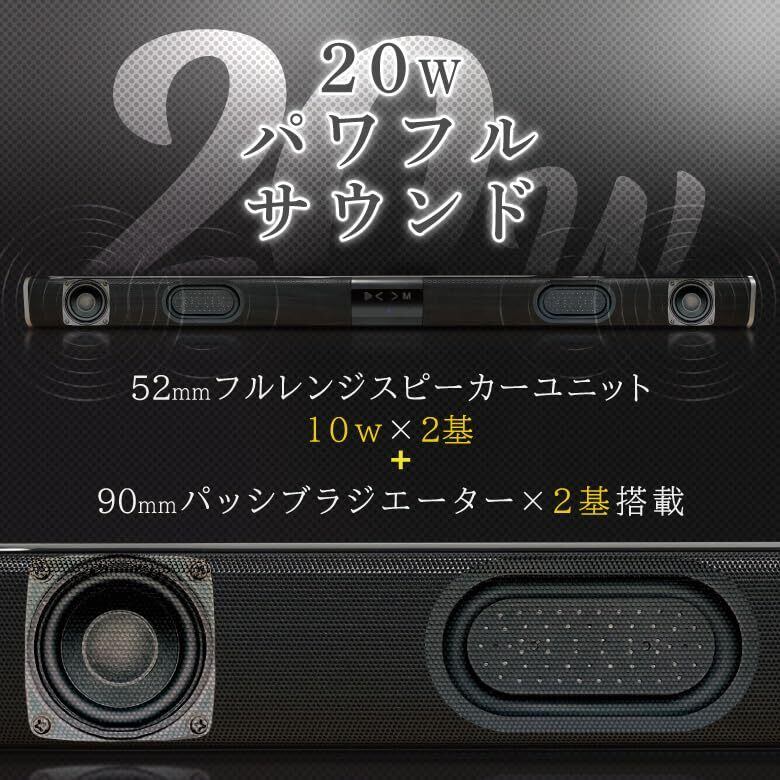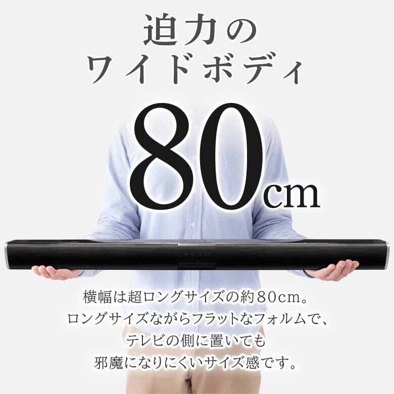 サウンドバーならではの迫力のワイドボディ横幅は超ロングサイズの約80cm。ロングサイズながらフラットなフォルムで、 テレビの側に置いても邪魔になりにくいサイズ感です。20wパワフルサウンド。52mmフルレンジスピーカーユニット10w×2基+90mmパッシブラジエーター×2基搭載