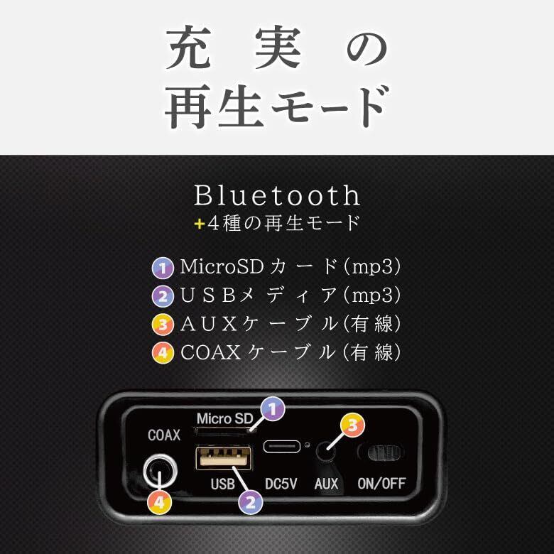 充実の再生モード。Bluetooth+4種の再生モード。MicroSD カード (mp3)、USBメディア (mp3)、AUXケーブル (有線)、COAX ケーブル (有線)。Bluetooth は最新のVer.5.4 を採用。スムーズかつ安定した通信で、スマートフォンや テレビの音源をワイヤレスで再生します。mp3 モード。mp3形式の音楽ファイルの再生にも対応。使用メディアは、 microSDカードとUSBメモリー の2種類を採用。