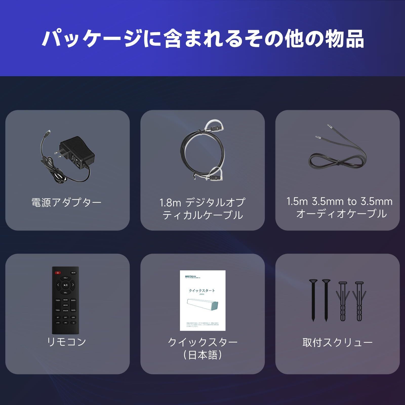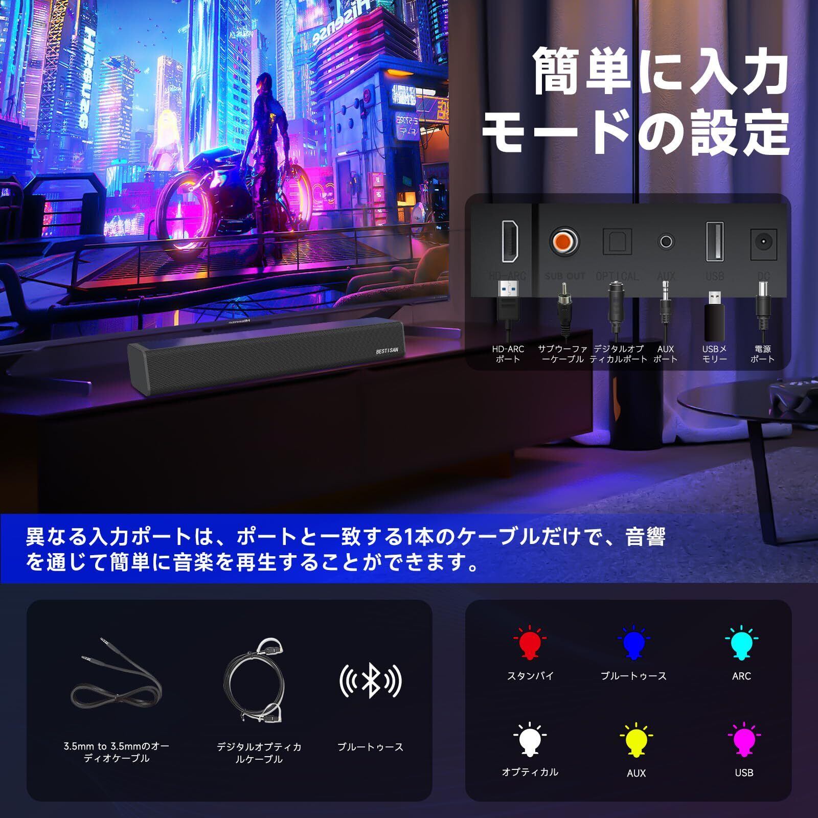 【接続方法】:新モデルのサウンドバーはBluetooth、AUX、HDMI(ARC)、USB、OPTICAL、SUB OUT、USBなど、多彩な接続方法に対応しています。サウンドバーはSUB OUT端子を介して外部サブウーファーに直接接続することができます。(USB端子はUSBメモリまたはカードリーダーの接続にのみ使用可能です)。デジタルオプティカルケーブル、3.5mm to 3.5mmオーディオケーブルが付属します