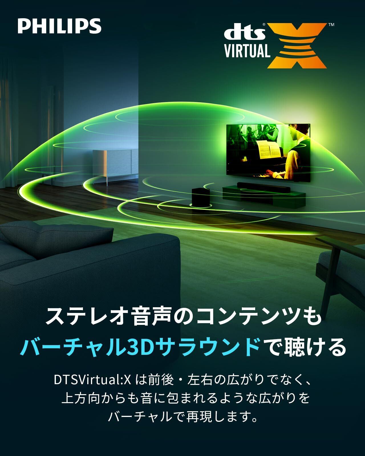 【映画館のような没入型サウンド】:PHILIPS サウンドバーは2つのユニットを内蔵で、バイネルスピーカーはステレオ効果を生み出し、空間に音楽のサラウンド分布を感じることができます。音楽をよりダイナミックに、思いのままに楽しむことができます。DTS Virtual:Xは広い3Dサラウンドサウンドを創造し、前面、左側、右側とサラウンドサウンドに高さを加え、より広く、より高く、より没入的なサウンド体験をお楽しみいただけます。雨や落雷、空中を旋回するヘリコプターなど頭上からのサウンドも的確に再現することで、アクション映画の視聴やテレビゲームのプレイに圧倒的な臨場感を与えます。
