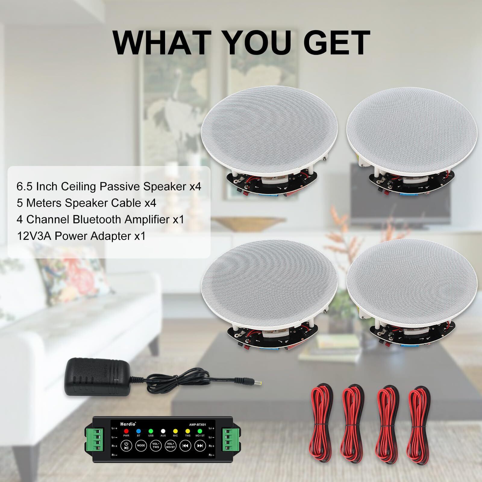 同梱品:6.5 "スピーカーx4、スピーカー接続ワイヤーx 4、アンプボックスx 1、パワーアダプターX1。