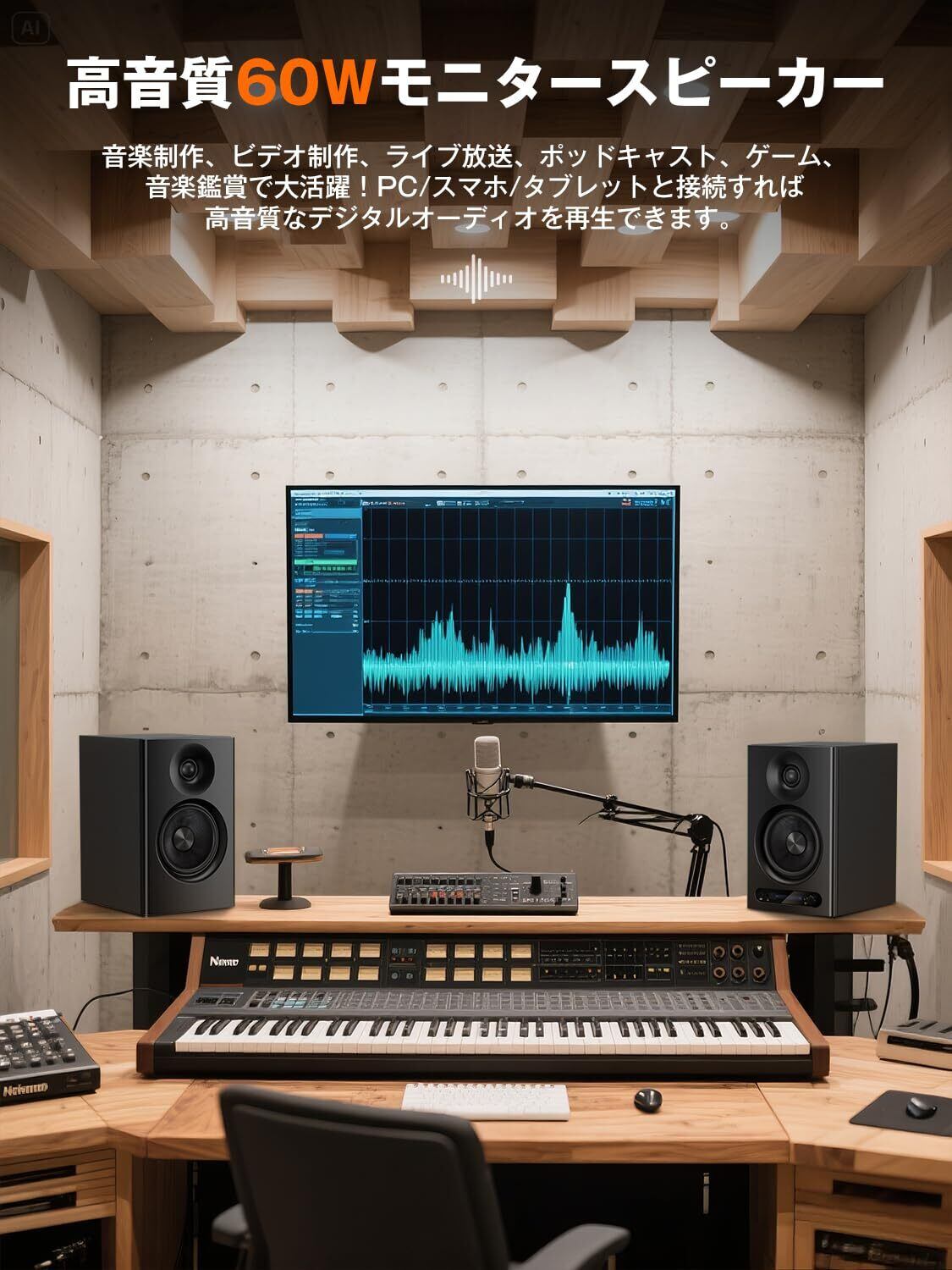 【高音質・高性能】このスタジオモニタースピーカーは、高忠実度オーディオ技術、4インチのウーファーユニット、1インチのツイーターユニットを採用し、クリアで正確なサウンドステージを再現します。60Wの出力で力強く迫力のある音響効果を確保し、低歪み率と高SN比により雑音のない純粋な聴覚体験を提供することで、プロの音楽制作と高品質のリスニングニーズを満たします。