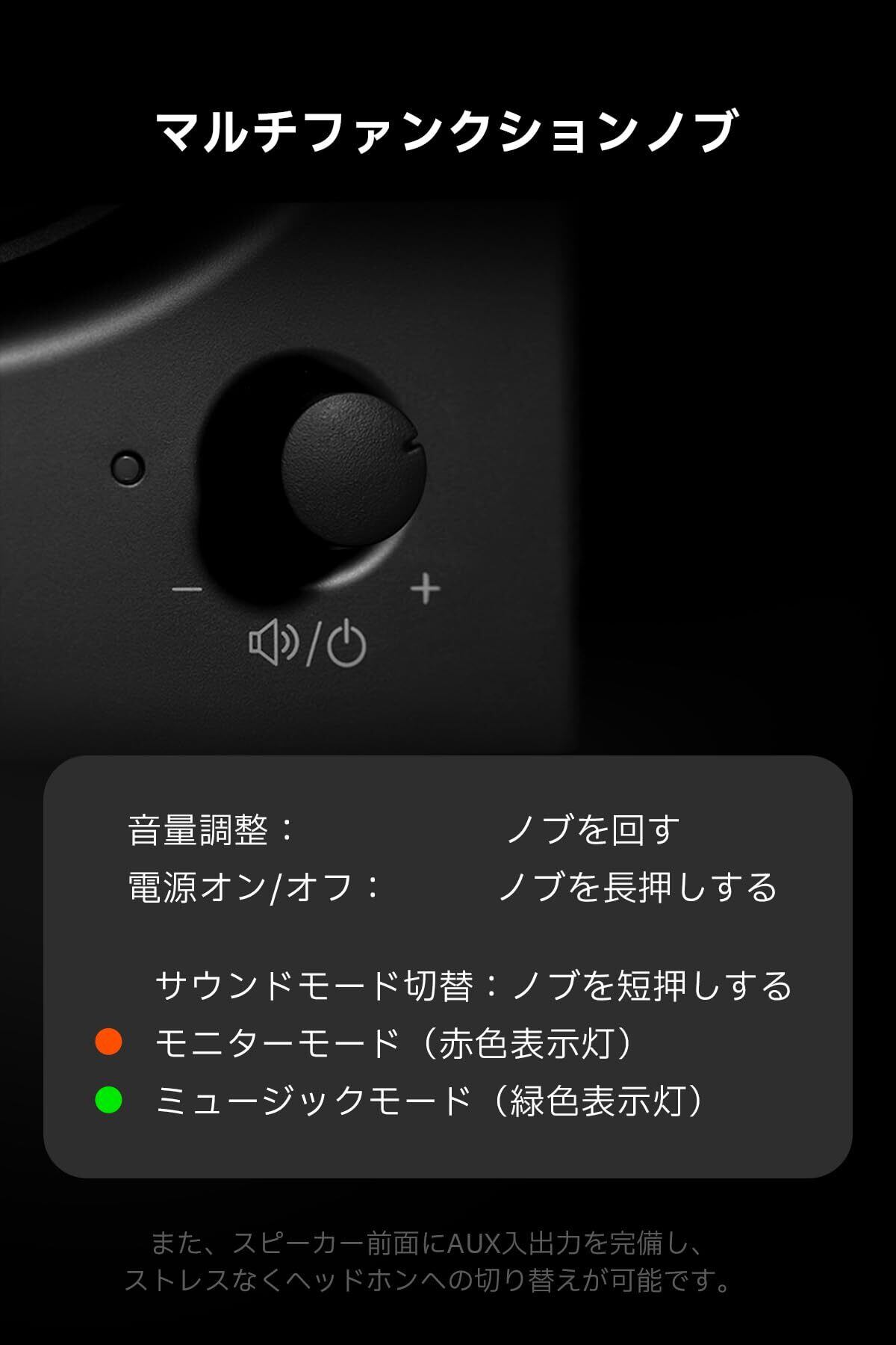 スタジオモニタースピーカー : ツイーターユニット 1インチ(約25mm)、ミッド・バスユニット 4インチ(約106mm) 、出力 : 42W(21W+21W)