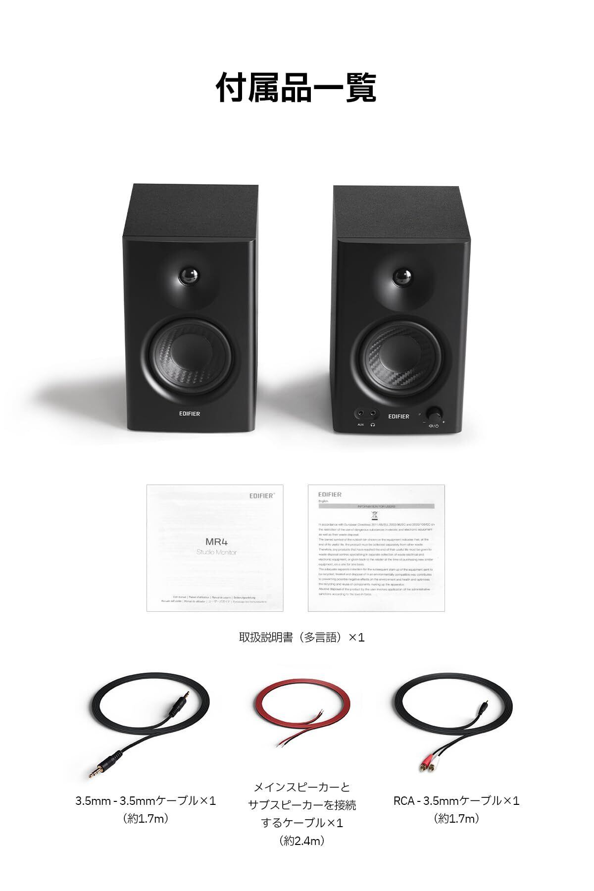 同梱品 : スピーカー本体(1 セット)、スピーカー接続ケーブル、RCA - 3.5mm ステレオミニプラグケーブル、3.5mm ステレオミニプラグケーブル、ユーザーズガイド(多言語)