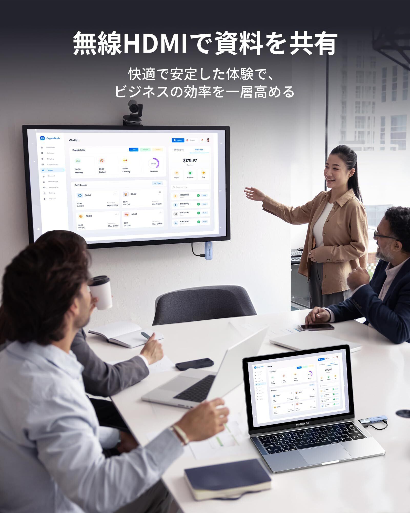 2つモード&プライバシー保護:ミラーリングモードと拡張モードの両方に対応し、利用シーンに合わせて柔軟に使い分けが可能です。さらに、ワンタッチプライバシー機能を搭載。ボタン一つで即座に接続を切断し、画面共有を停止できます。これにより、個人のプライバシーや機密情報をしっかりと保護。ビジネス会議での資料共有時も、情報漏洩の心配なく安心してご利用いただけます。