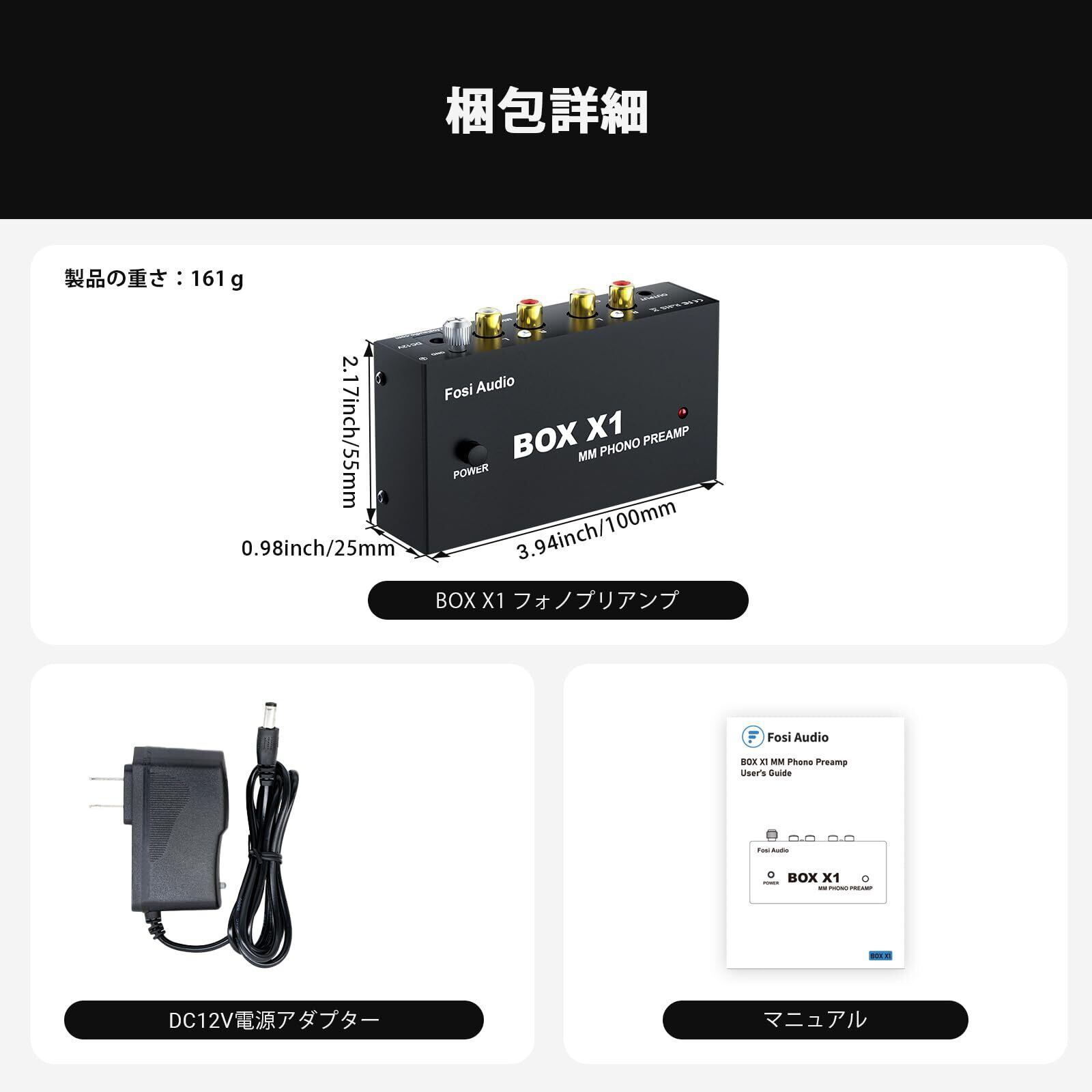 Fosi Audio BOX X1 フォノ プリアンプ MM ポータブルヘッドフォンアンプ 超コンパクトミニステレオ Phono 3.5MMヘッドフォン・RCA出力 蓄音機・レコードプレーヤー ターンテーブル用 DC12V電源アダプタ付き