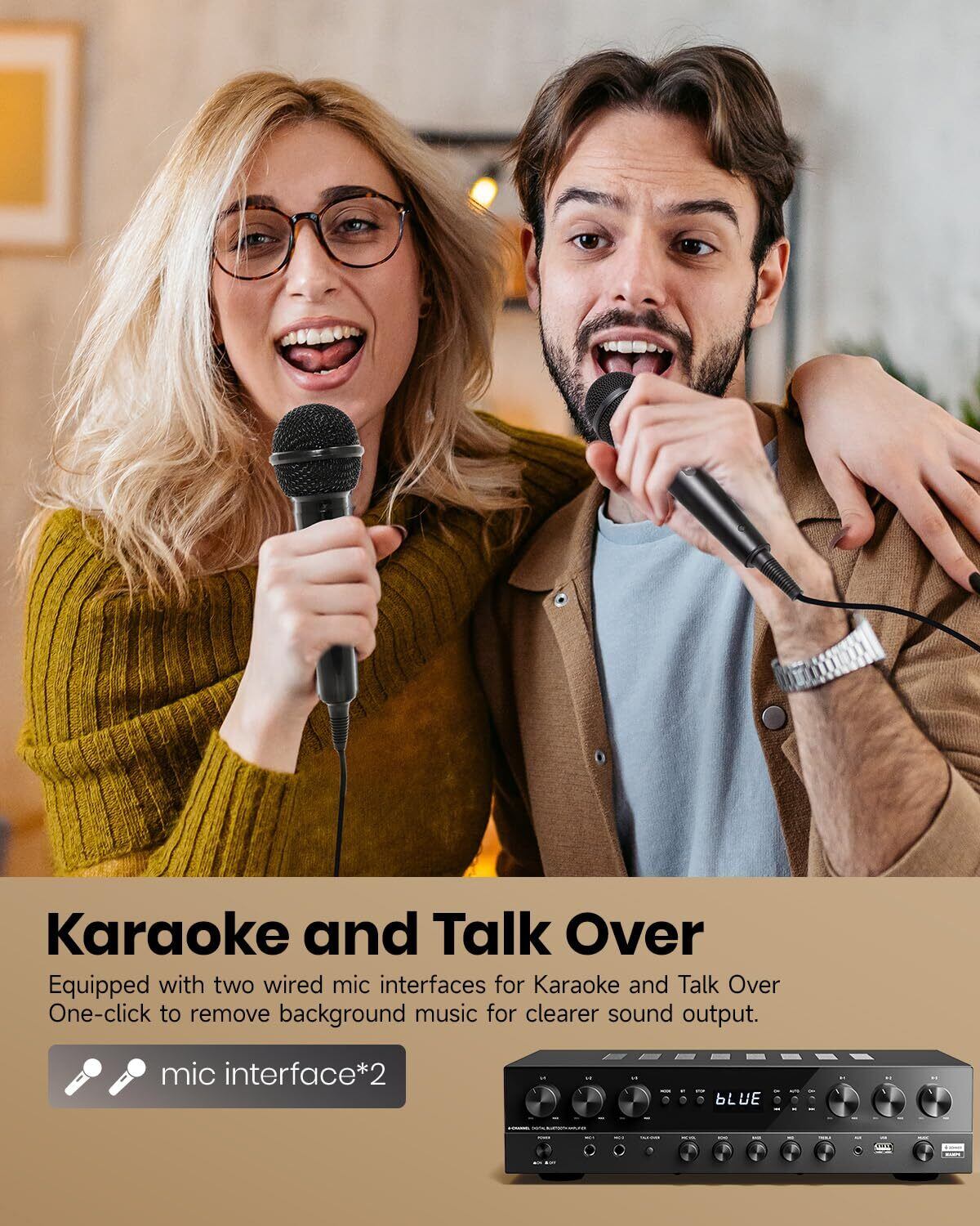 デュアルマイクインターフェース: デュアル1/4''マイク端子を装備し、カラオケパーティーで活躍します。また、トークオーバー機能により、イベントや司会、スピーチなどの場面で、BGMを下げてクリアなサウンドを出力することができます