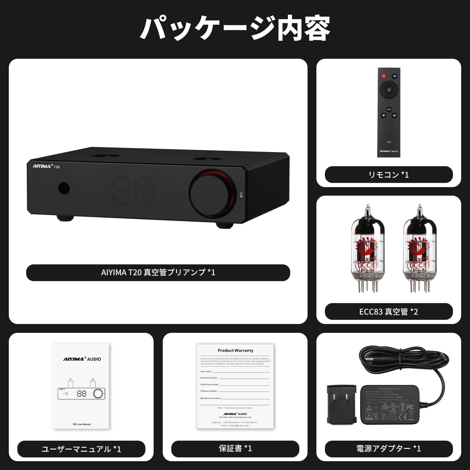 【パッケ-ジ内容】AIYIMA T20真空管プリアンプ*1、取扱説明書*1、ECC83真空管*2、12V/2A電源アダプタ*1 (注意:T20は専用電源アダプター(DC12V)を使用してください。互換性のない電源や電圧が高すぎる電源は使用しないでください)、リモコン*1 ,24ケ月安心と迅速な力スタマ-サ-ビス。
