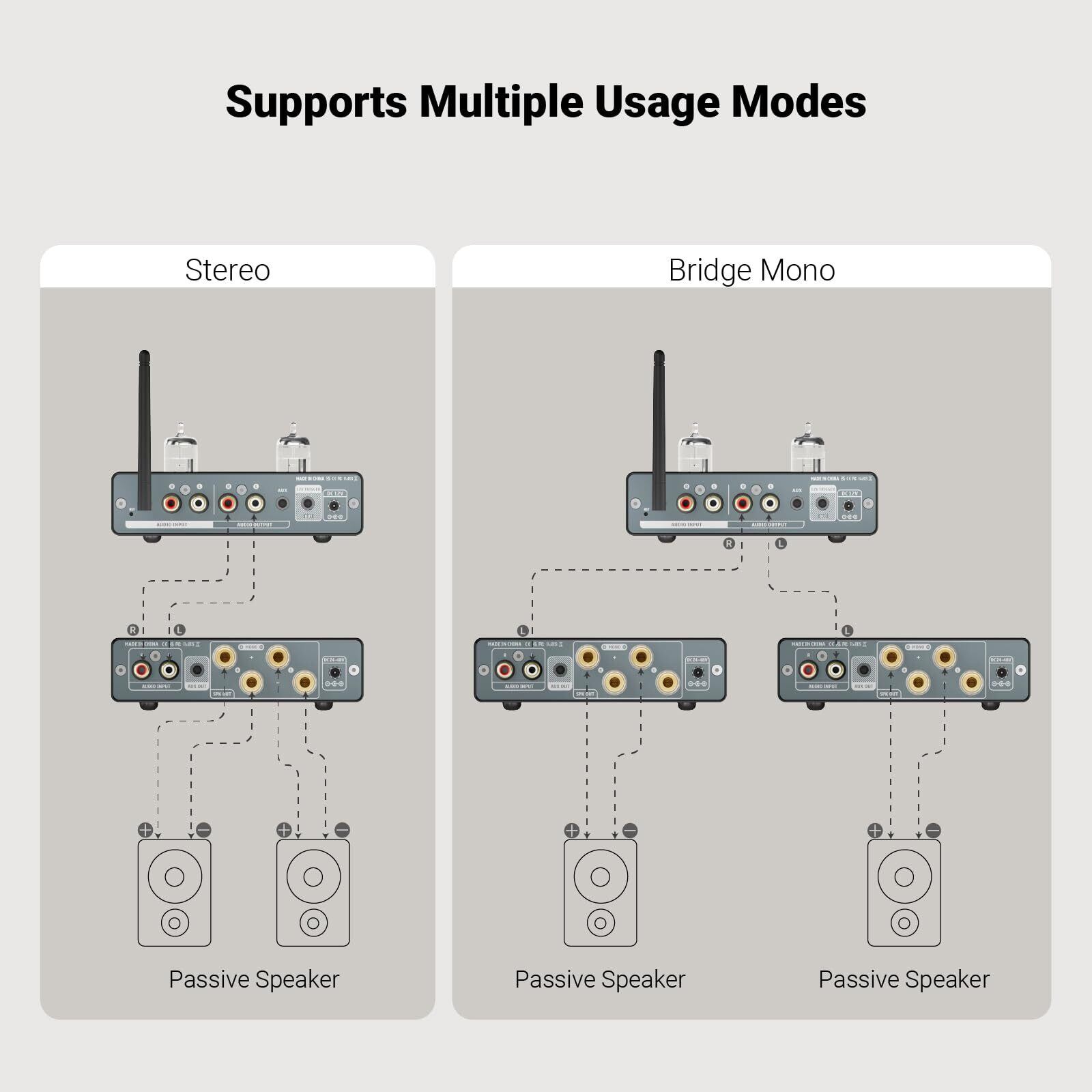 2.【600Wブリッジ可能なモノラルアンプモード】。革新的なブリッジ設計により、本体底部のファンクションスイッチを切り替えるだけで、簡単に600Wモノラルブリッジアンプを設定することができ、3.5mm AUXライン出力を備えたA07 MAXを次のA07 MAX(アクティブデバイス)に接続し、ハイパワー・デュアルチャンネルシステムを構築し、オーディオアンプのパワーを最大限に追求することができます。