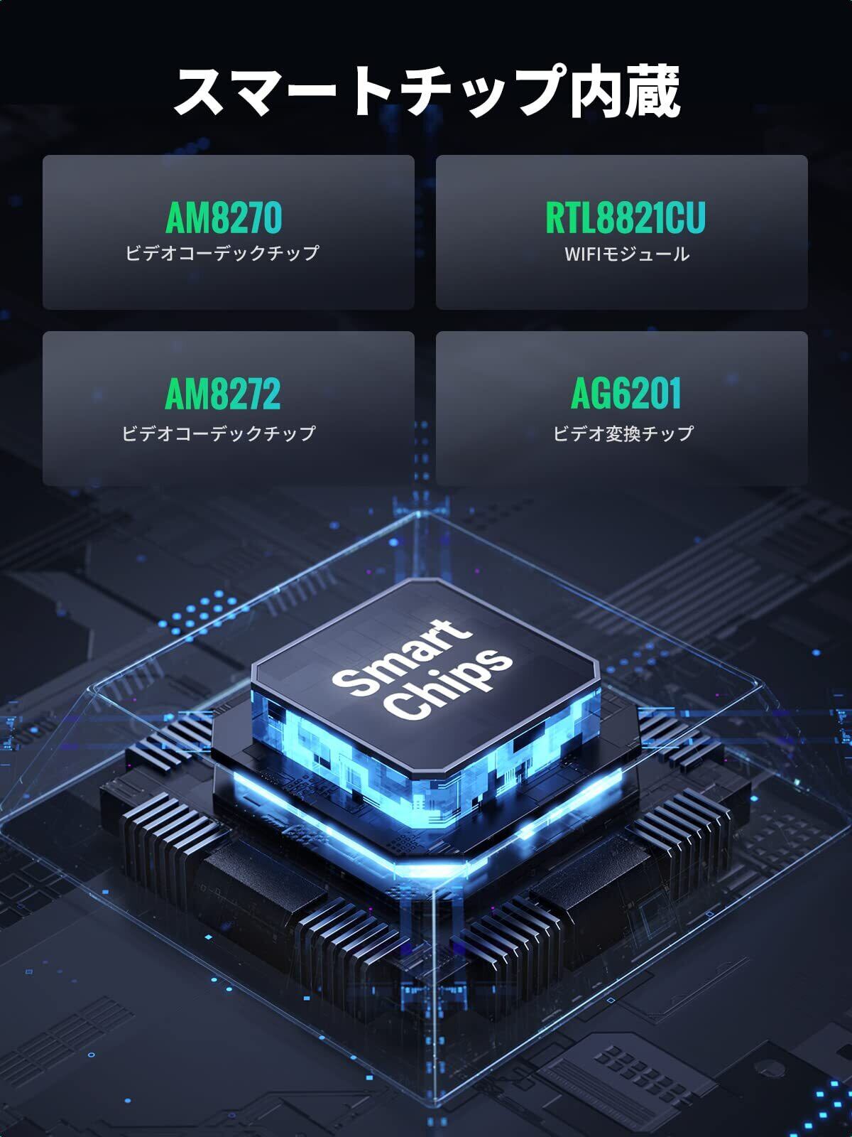 【5GHz無線伝送規格技術採用】5G無線伝送規格技術を採用し、AM8270+AM8272+RTL8821CU+AG6201スマートチップが搭載され、旧世代チップに比べて接続の安定性が格段に向上します。0.1秒の低遅延仕様なので、映像を楽しむ様なコンテンツやプロジェクターによるPC画面出力といったシーンでの利用には最適です。