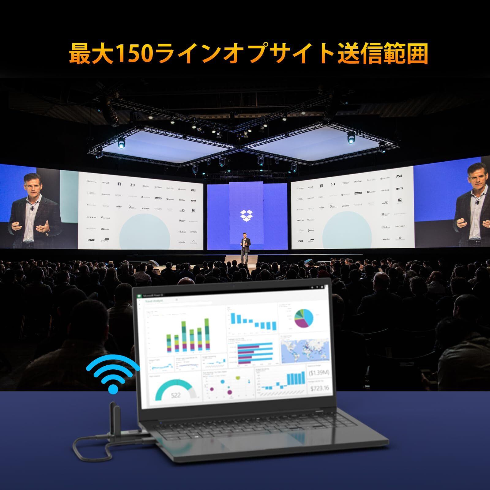 【強力デュアルアンテナ設計】:開放環境下で最大150メートル(約492フィート)の安定通信を実現。デュアルアンテナによるロバストな信号伝送で、途切れない滑らかな映像配信を。