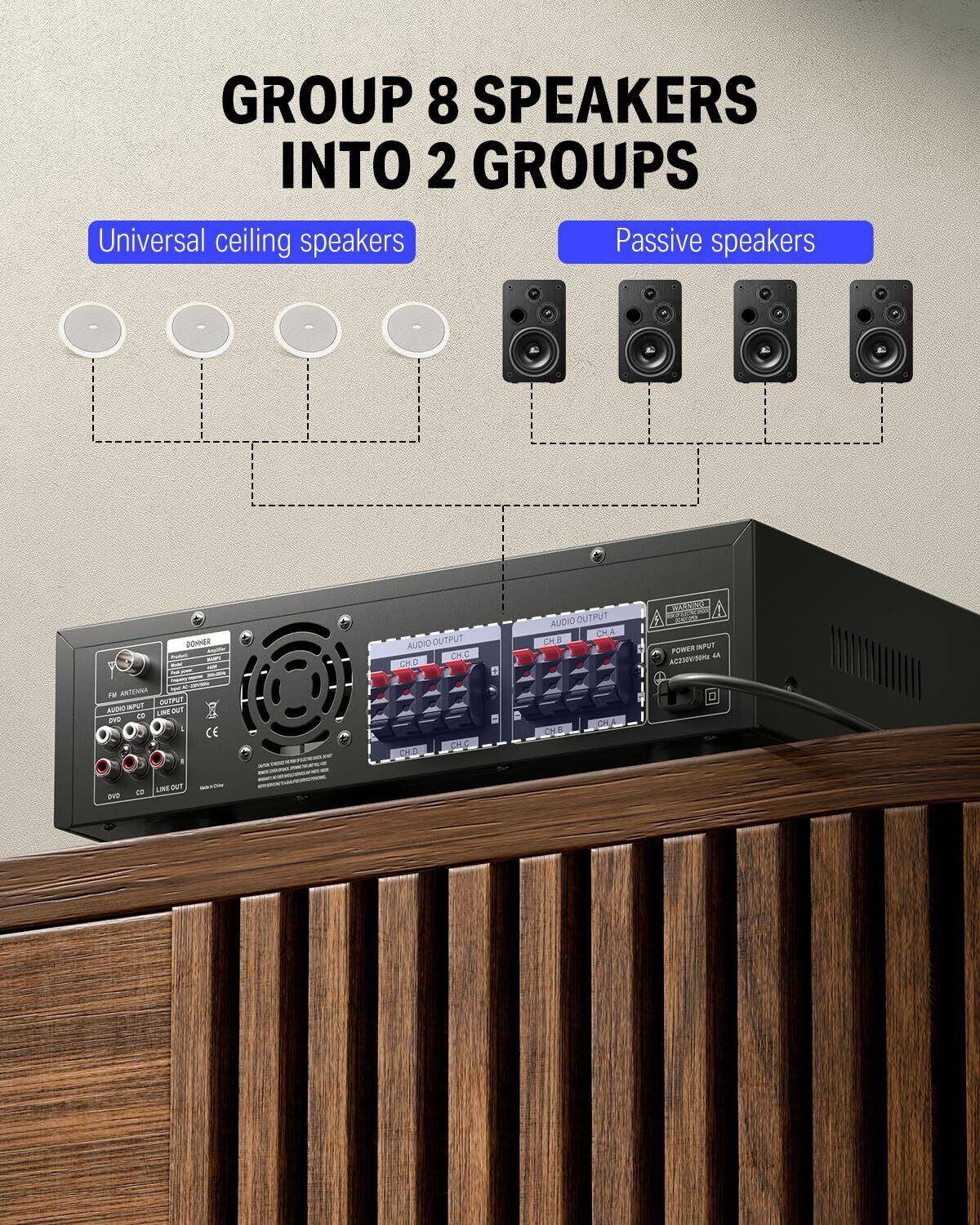 440ワット: Donner パワーアンプは、カラオケ、ホームシアター、音響システム、モニターヘッドフォンに最適です。4セットのスピーカーを適応でき、十分な強電力増幅を提供します。各スピーカーは個別に制御できます。サイズ:42.5cmx31cmx16.7cm 注:接続方法:アップ——ブックシェルフ型スピーカー