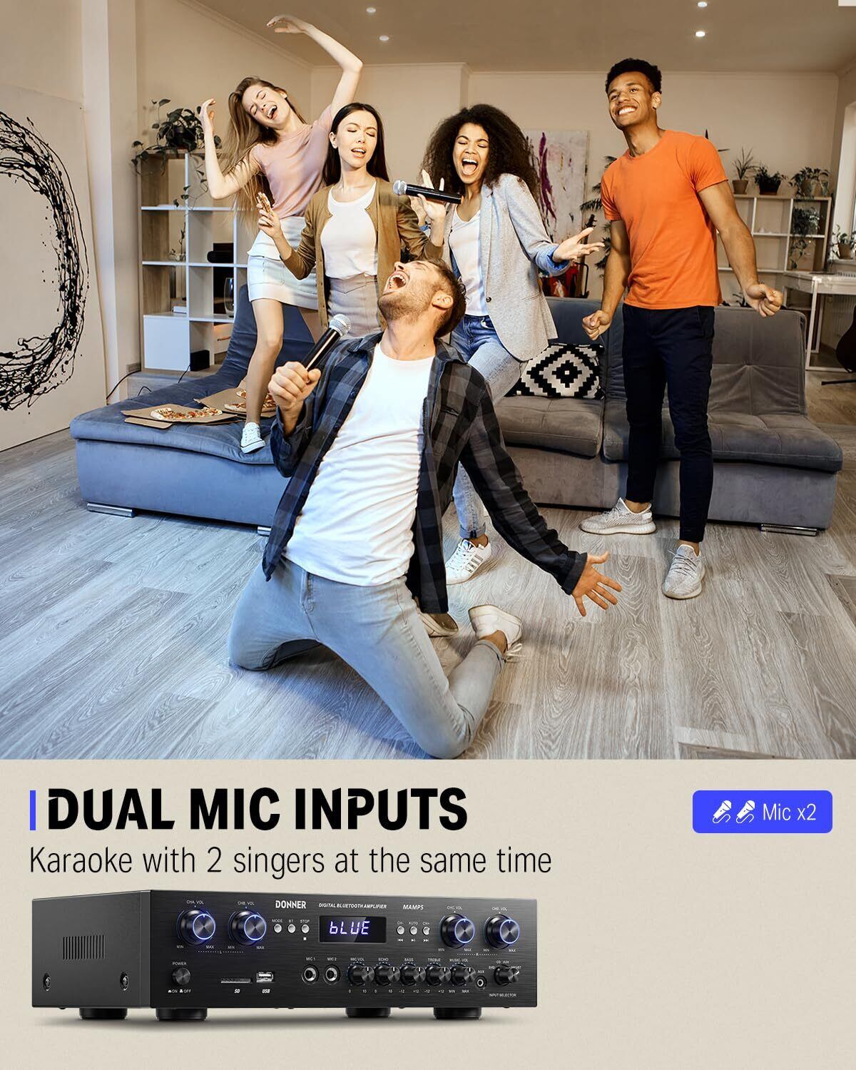 Donner パワーアンプ Bluetooth5.0 オーディオアンプ 出力440W オーディオステレオレシーバー USB/SD/FM/2MicINEcho/RCA/LED スタジオ ホームユース MAMP5