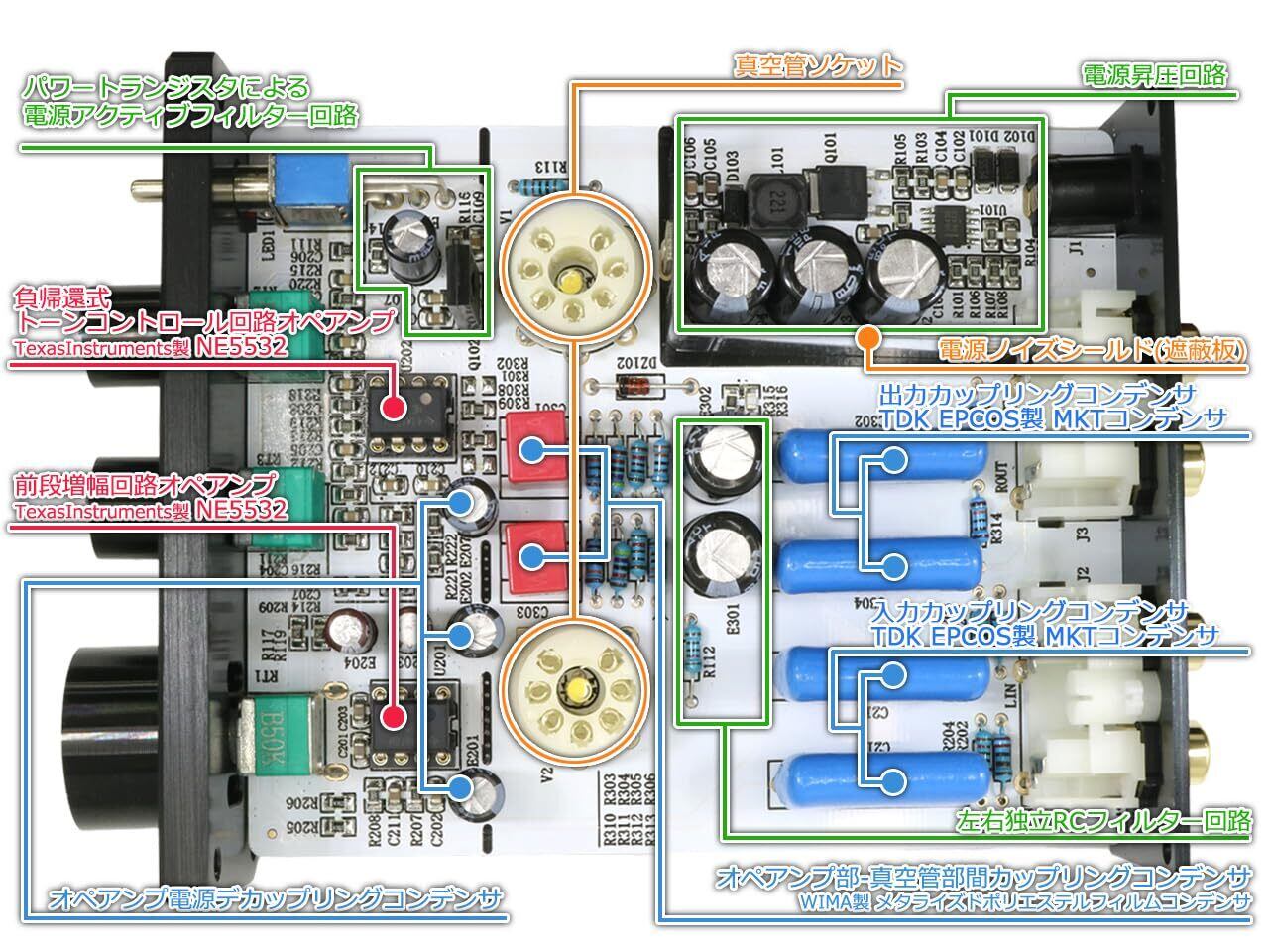 前段バッファ部およびトーンコントロール部には、音質面で定評のあるTexas Instruments製オーディオ用 オペアンプ「NE5532」(DIPソケット式)を採用!