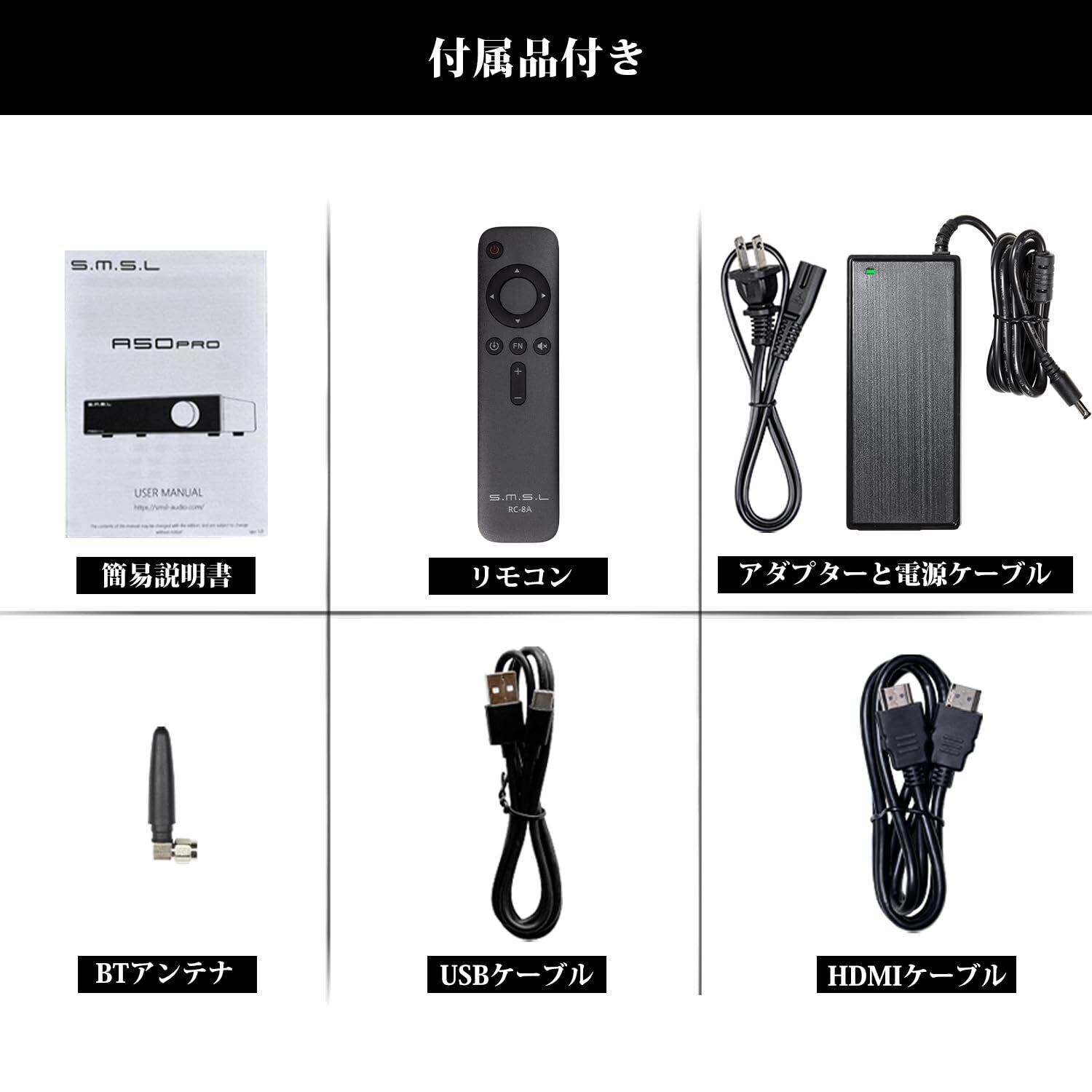S.M.S.L A50PRO アンプ Bluetooth 小型 パワーアンプ アンプICx2搭載 / HDMI(ARC)対応/EQ・高低音調節可能/リモコン操作 / 2.1ch・2.0ch 超低音出力 クラスD オーディオ・アンプ USB 光ファイバ