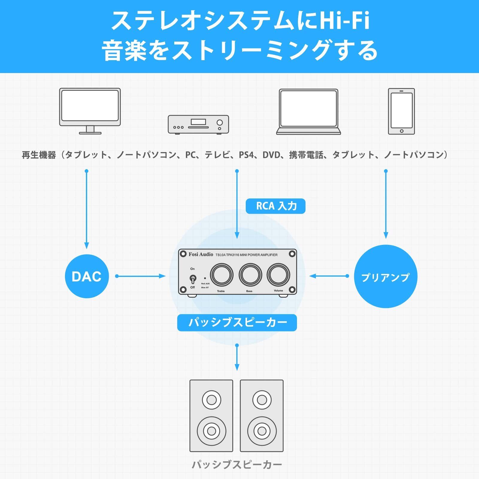 Fosi Audio TB10A 2 チャンネルアンプ 100W x 2 パワーアンプ ステレオ オーディオアンプ レシーバー TPA3116 ミニ Hi-Fi クラスD 内蔵アンプ 2.0CH ホームスピーカー用 低音と高音のコントロール付き (電源付き)