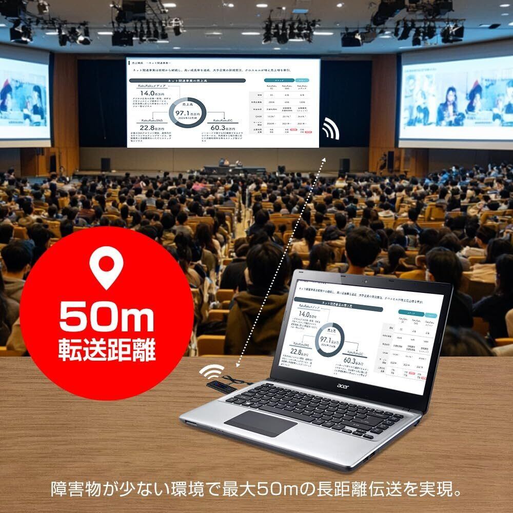 【最大50mの長距離伝送】受信機と送信機の距離は、最大50mまで離れた場所でも繋がります。例えば、大きな会議室やミニシアターなど様々な利用シーンで活躍します。※障害物が少ない環境で最大50mの長距離伝送を実現。また、一つの受信機に対して最大8台までの送信機をサポートしているので、会議やプレゼン、ホームエンターテインメントに最適です。