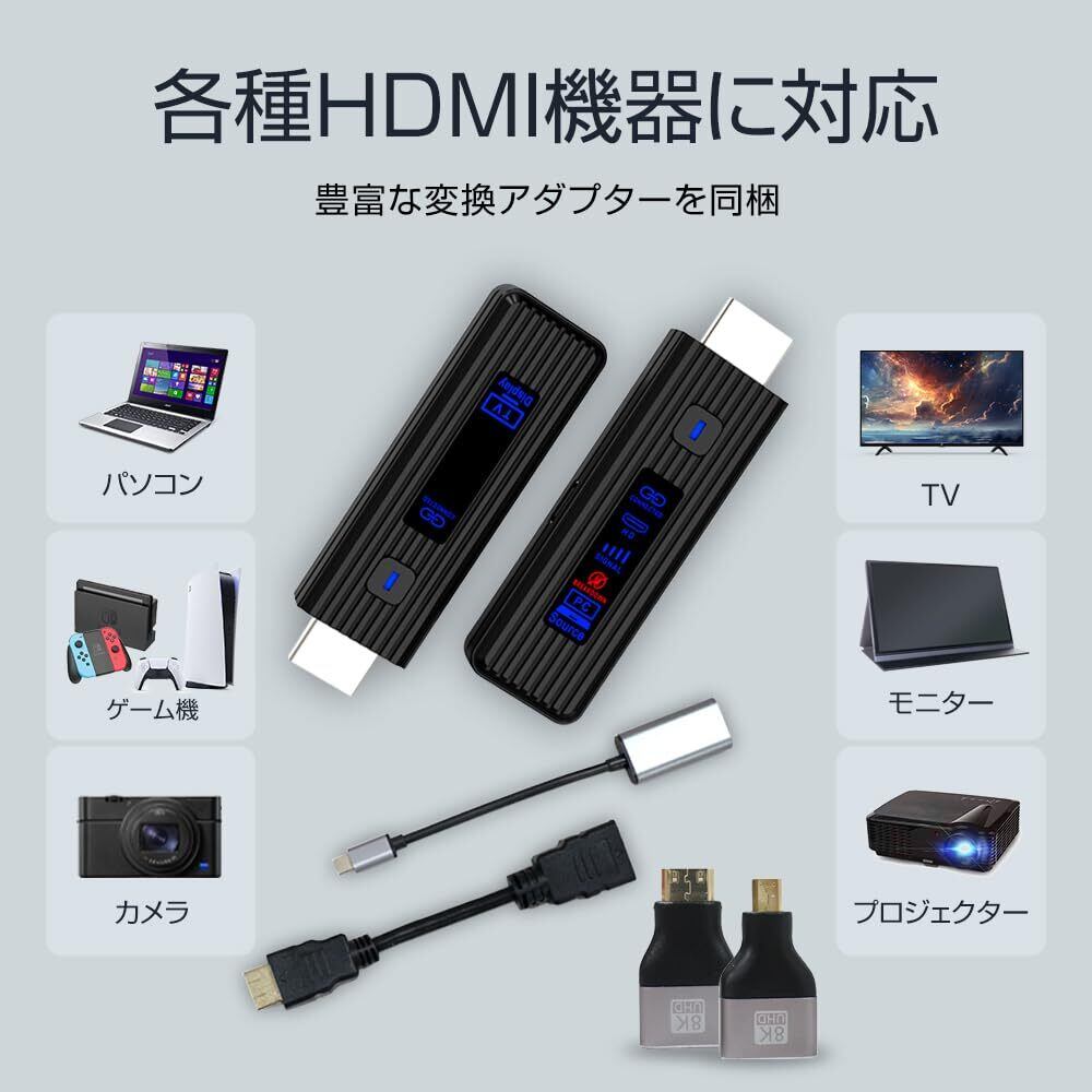【同梱内容も豊富!多くの機器をサポート】送信機×1、受信機×1、USB-C(受信) to HDMI(送信) 変換アダプターケーブル×1、HDMI延長ケーブル(オス-メス)×1、USB-C to USB-A 電源ケーブル×2、HDMI変換アダプター(micro HDMI/mini HDMI)×各1