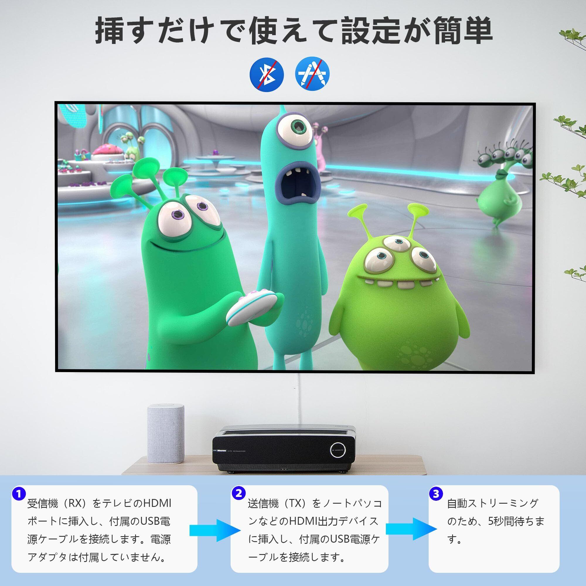 【技術基準適合証明】本製品は日本での技術基準適合証明(技適)を取得しています(技適番号:214-240422)。技適証明取得をしている製品のご使用を推奨いたします。邪魔にならないコンパクトサイズです。リビングのテレビボード横などに設置しても、圧迫感がありません。【梱包内容】HDMI送信機x1、HDMI受信機x1、給電用USBケープルx2、日本語取扱説明書x1。このワイヤレスHDM送受信機セットには、サージ保護、過負荷保護、および過熱(高温)保護を提供する安全システムも装備されています。
