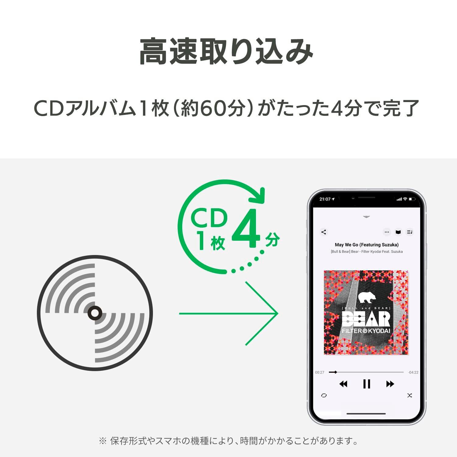 【パソコンなしでCDをスマホに入れて聴くCDレコーダー】「CDレコSE」は、お気に入りの音楽CDをスマホに入れて聴けるスマホ用CDレコーダーです。CDレコSEは、スマホとケーブルで接続します。専用のアプリ「CDレコミュージック」をインストールし、カンタンな操作でCDを取り込めます。