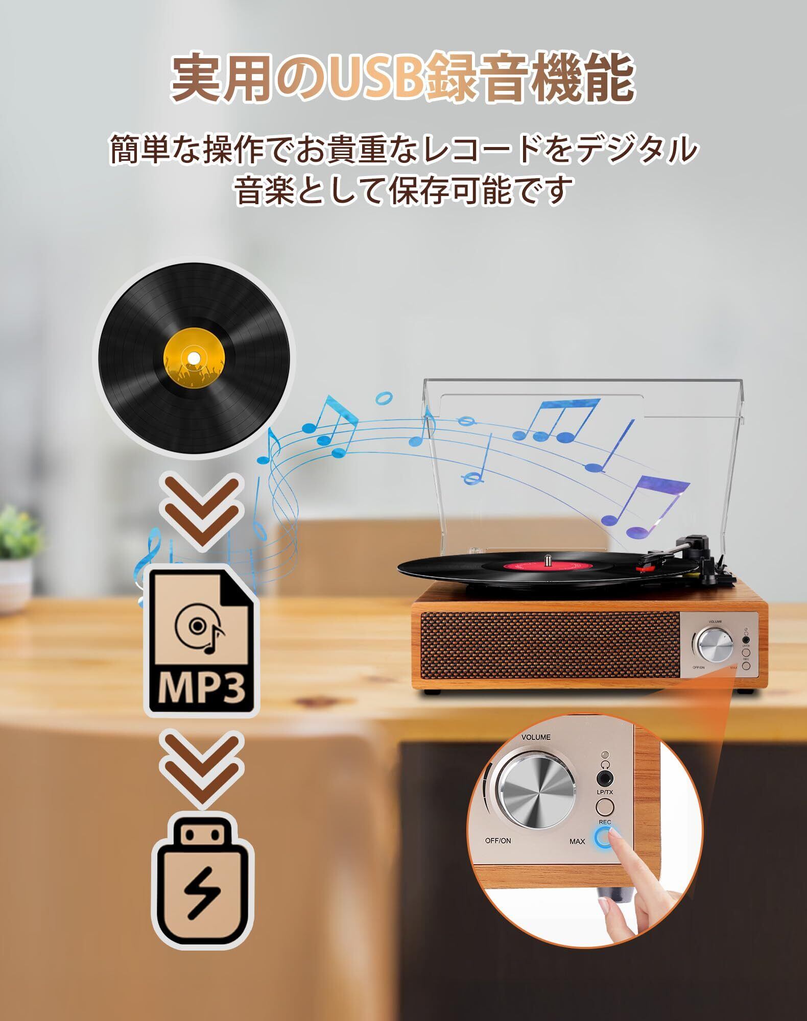 【USB録音&音楽再生】レコードを再生している際にUSBメモリを本機のUSB端子に挿して、ボタンを押して簡単にレコードの音楽がUSBデバイスへ録音させます。レコードの再生することが停止すれば、自動的にUSBモードになります、手軽にUSBデバイスから音楽を再生します。