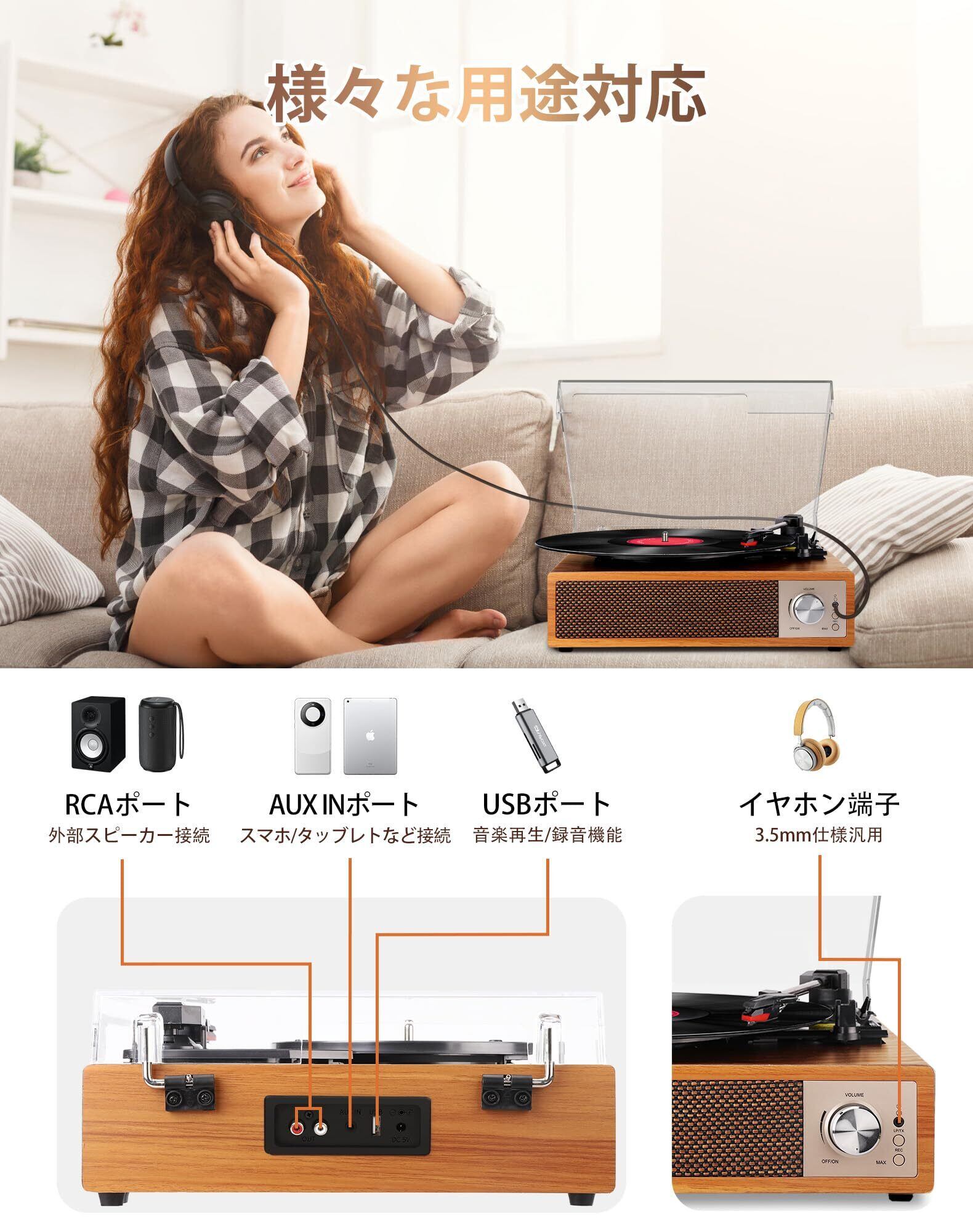VOKSUN レコードプレーヤー Bluetooth送信と受信 USBで録音と音楽再生 スピーカー内蔵 RCAでスピーカー繋ぎ イヤホン接続 33/45/78回転と7/10/12インチ対応 AUX in 防塵蓋 日本語説明書 木目調