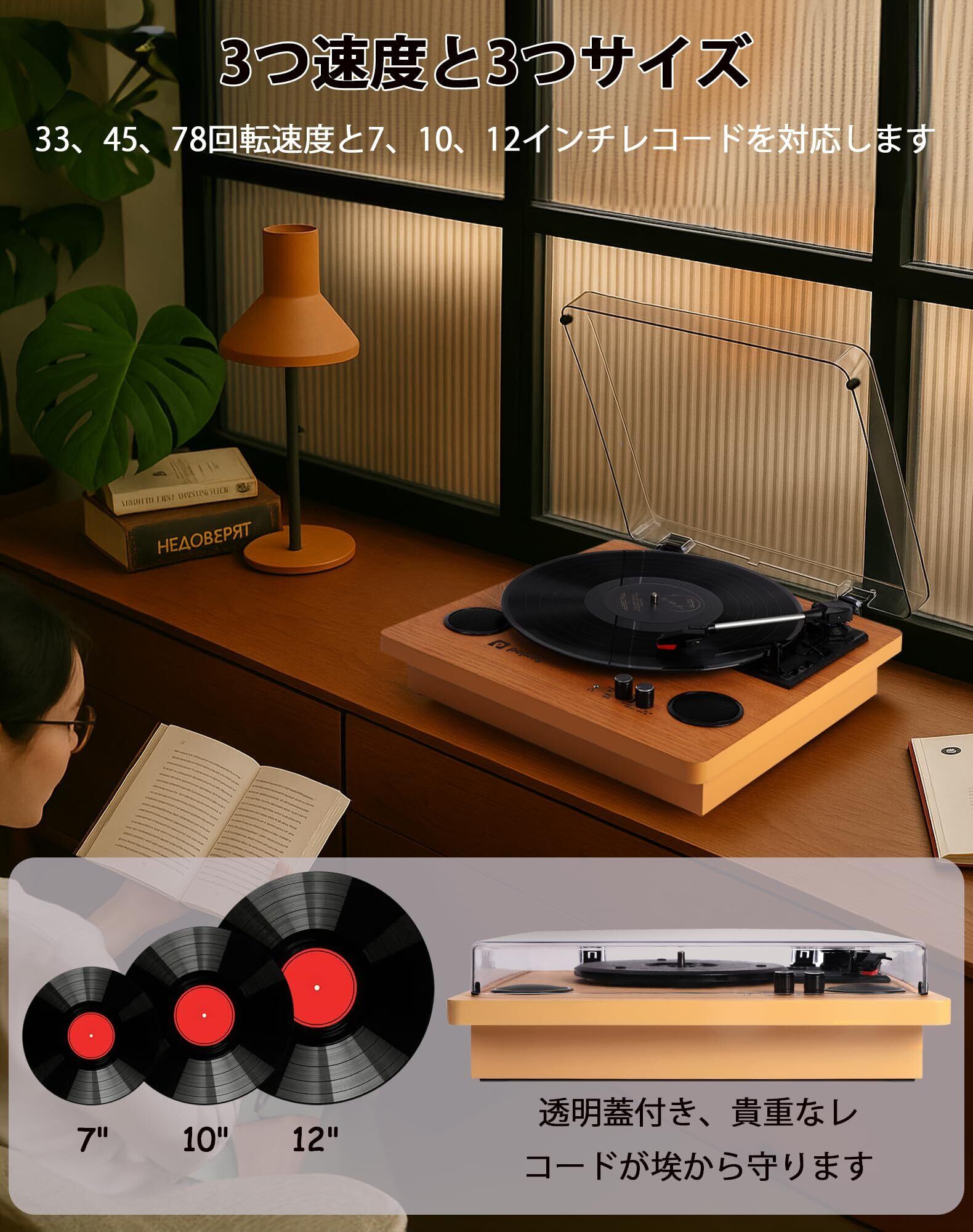 【3つ回転速度対応】音楽のジャンルやお好みに応じて、33-1/3、45、78という3つの再生速度を選べます。7、10や12インチのほとんどのレコードと互換性があります。内臓のステレオスピーカによって高品質のクリアな音を出します、家にも演奏会の臨場感を持ちます。