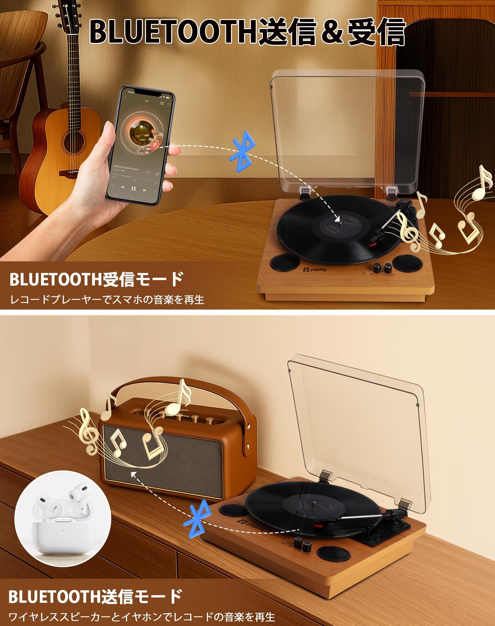【Bluetooth送信と受信両対応】2025年新登場ブルートゥース送信機能付きレコードプレーヤーです、手軽にワイヤレススピーカーとイヤホンを接続可能です、混雑なケーブルないのでもっと便利です。Bluetooth受信機能によってスマホからの音楽を簡単に再生させて、レコードの購入金を節約します。