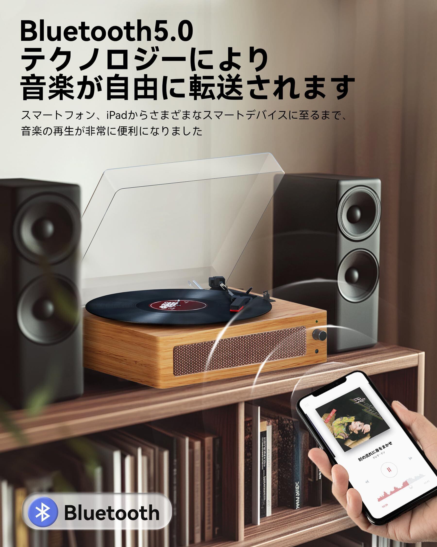 【クラシックとモダンの音符が交わる】この音楽プレイヤーはBluetooth対応で、レコードプレーヤーと完璧に組み合わさり、非常に便利です。プレーヤーはBluetooth 5.0技術を搭載し、伝送距離は最大10メートル。蓄音機はスマートフォンやタブレット、PCに簡単に接続でき、音楽を制限なく楽しめます。レコードのコレクションが少なくても、Bluetoothを通じて多くの曲を楽しみ、Bluetoothスピーカーとしても使用でき、お気に入りのデジタル音楽を再生できます。この効率的で便利な音楽体験により、いつでもどこでも素晴らしい音符を楽しみながら、LPレコードの独特な魅力を感じ、クラシックとモダンの完璧な交わりを体感できます。