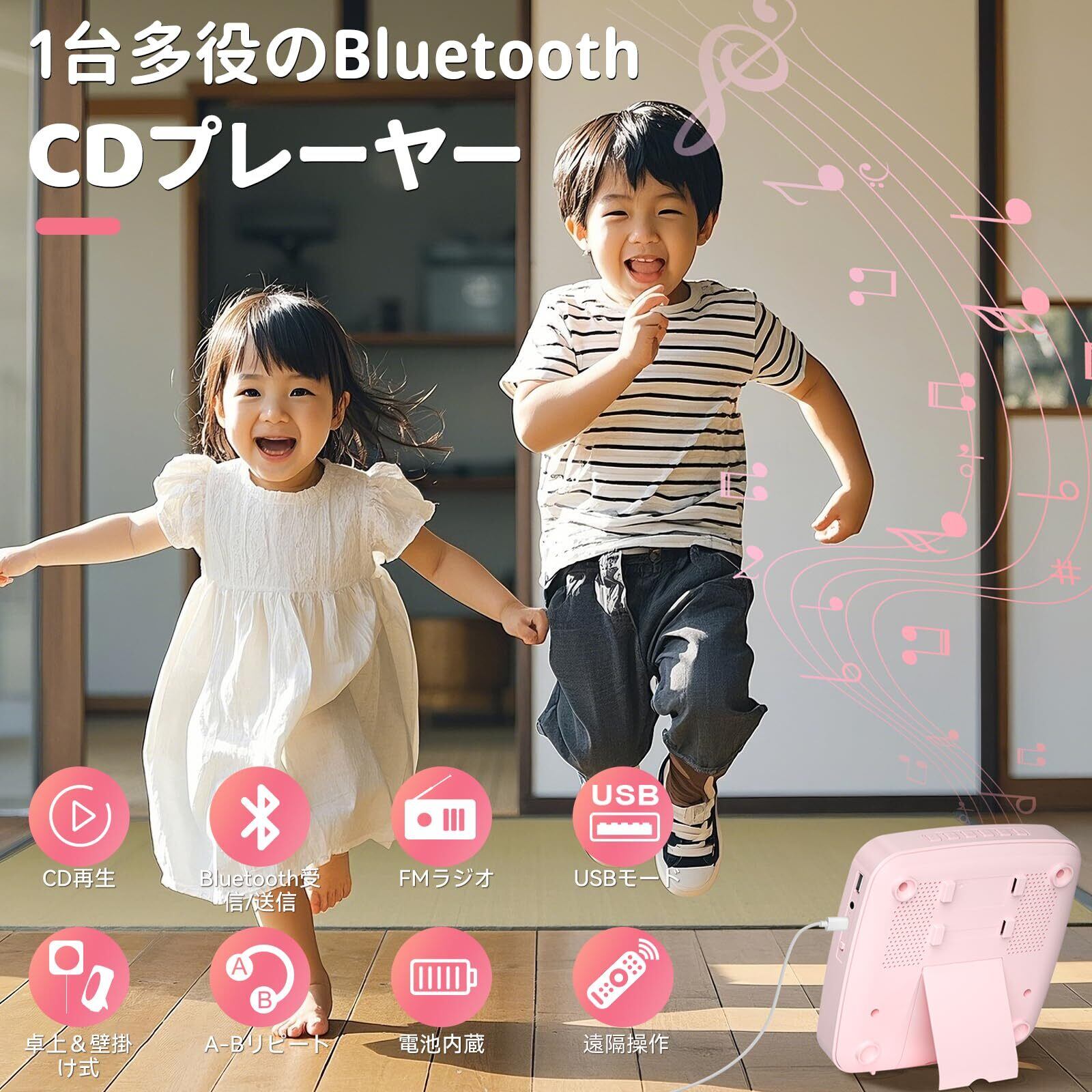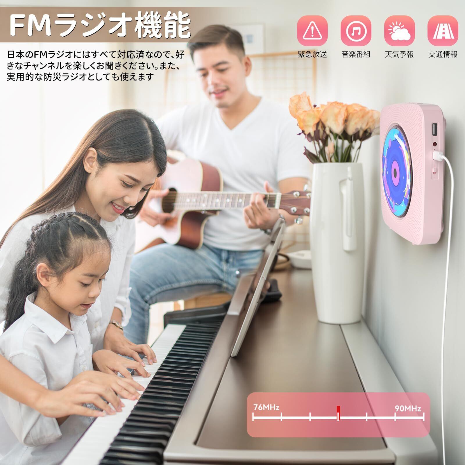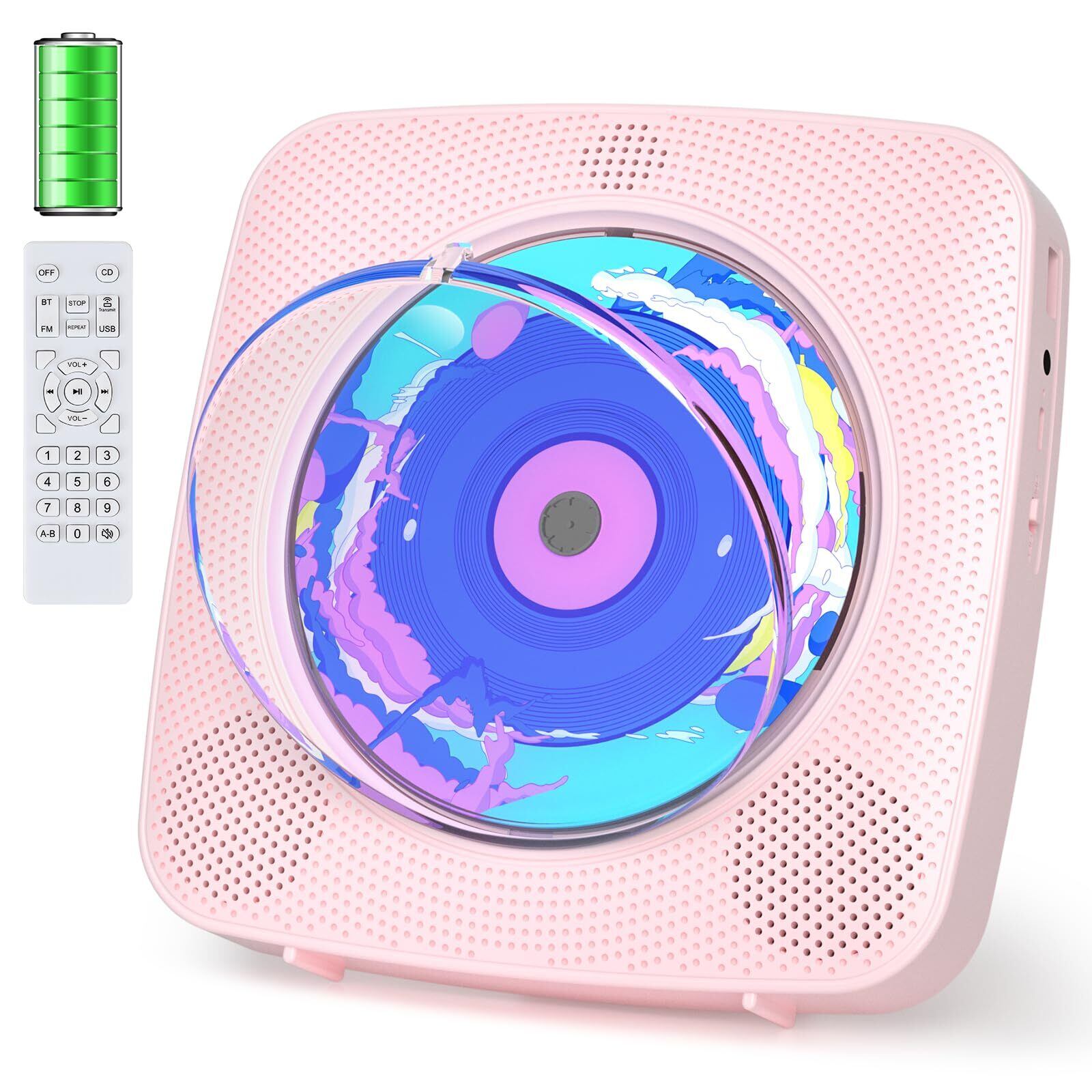 CDプレーヤー Bluetooth 受信/送信 cdラジカセ スピーカー内蔵 卓上&壁掛け式 プレイヤー 電池内蔵 USB充電式 1台多役 FM/USB対応 A-Bリピート再生 音楽再生/語学学習/胎児教育 日本語説明書付き(ピンク)