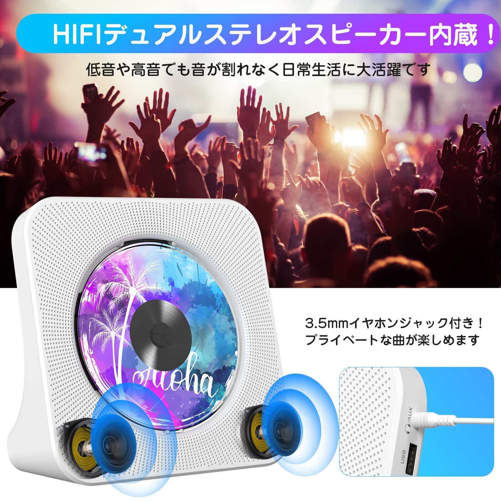「高音質スピーカー内蔵&3.5mmイヤホンジャック付き」本CDプレーヤーは、立体的なミュージックが再生可能なHi-Fi高音質スピーカーを内蔵しており、低音や高音でも音が割れなく日常生活に大活躍です。更に、3.5mmイヤホンジャックも付いて、別売りの3.5mmイヤホンでプライベートな曲が楽しめます。ご注意:1、イヤホンをプレーヤーに接続する前に必ず音量を下げてください。2、イヤホンの接続の状態でスピーカーがOFFになります。