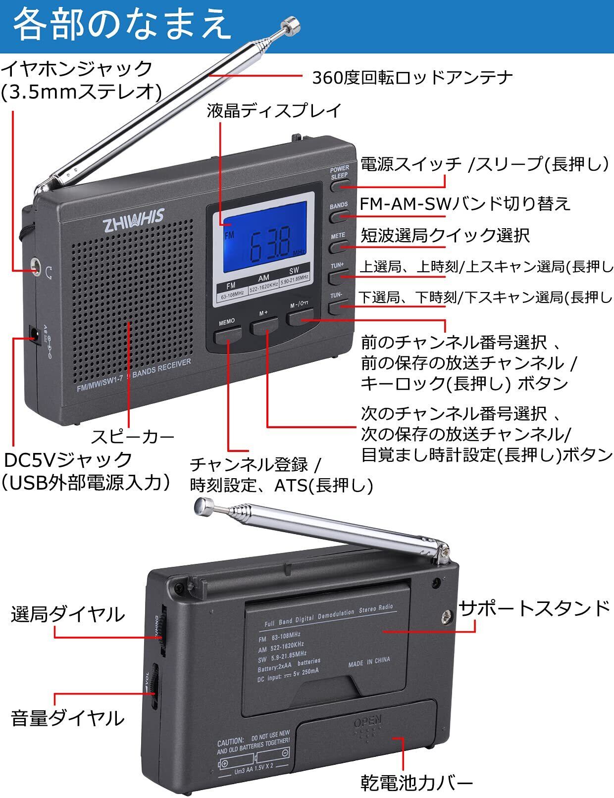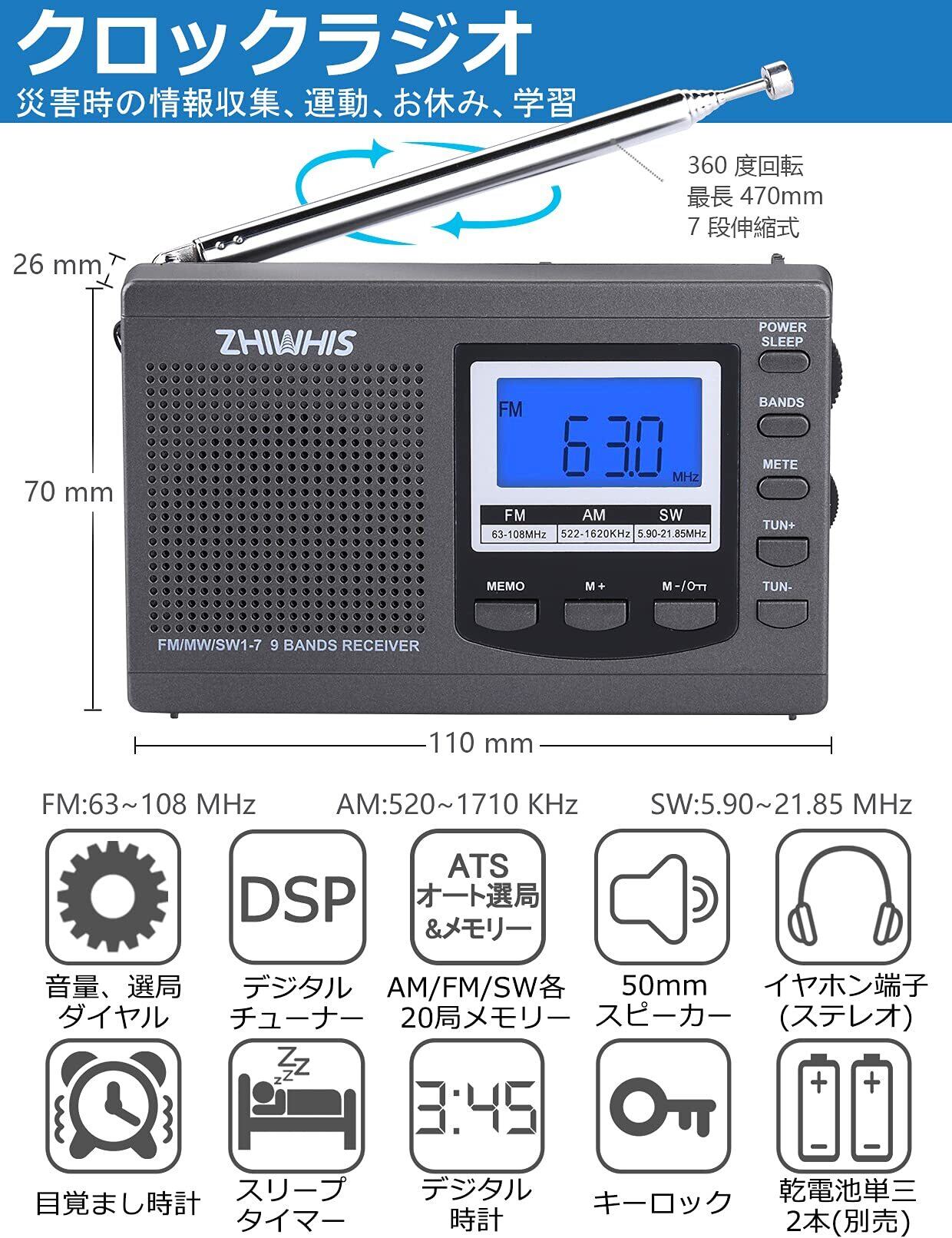 ZHIWHIS ラジオ 小型ポータブル FM/AM/SW ワイドfm対応 高感度クロック防災ラジオ 電池式 タイマー/目覚まし時計/デジタル時計/キーロック/プリセット機能付き 横置き型 携帯 学習 災害用 日本語取説&書付き