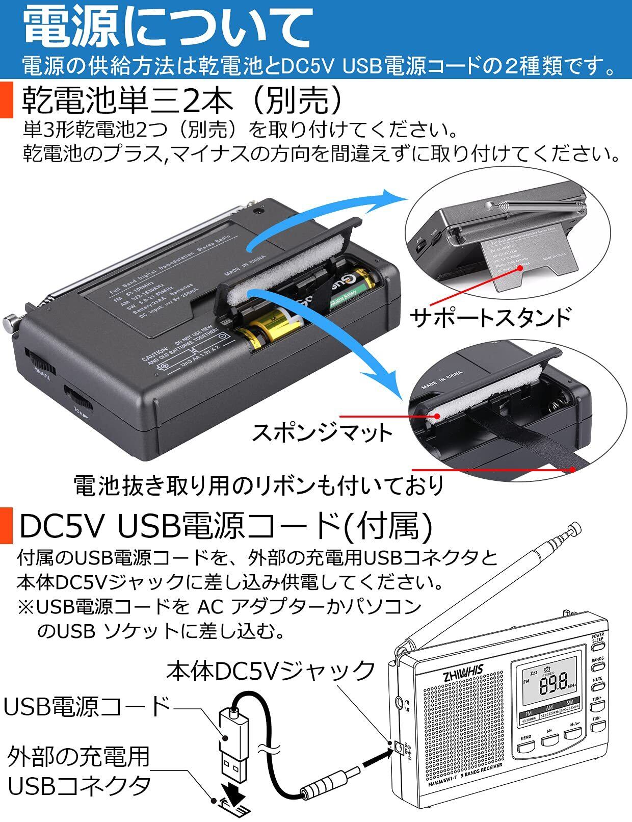 「電源の供給方法・ダイヤル式」 単三形乾電池2本にて電源を供給し、長時間に使用できます!外部電源DC5Vに接続可能なので、ご外出する時や家にいる時も便利にご利用いただけます!チャンネル選択モードは、ボタン式とダイヤル式の二種類に対応しています。また、ボリュームはダイヤル式で調整し、操作が簡単です。