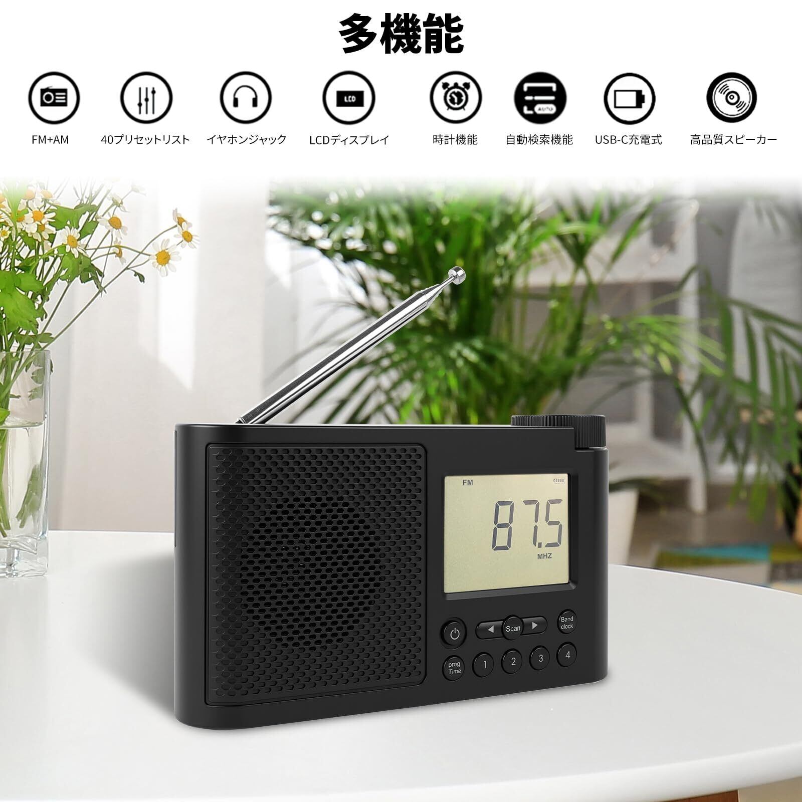 【FM/AMラジオ】このラジオは、クリアで心地よい音質を実現するFM/AMモードを搭載しています。利用可能な放送局を自動的に検索し、プリセットリストに保存します。P01~P04ボタンを使って、お気に入りの放送局を簡単に保存できます。