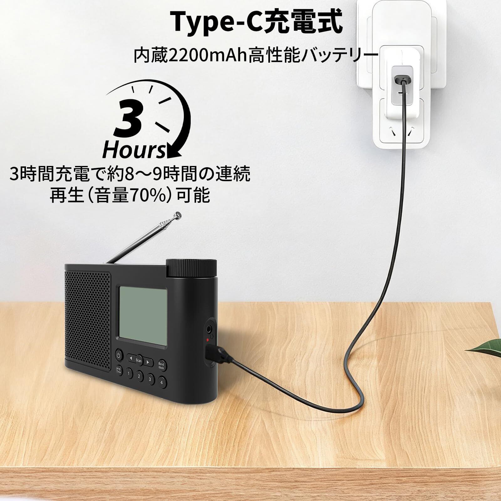 【USB-C充電式】付属のUSBケーブルまたは内蔵の2200mAh高性能バッテリーで駆動し、フル充電で約8~9時間の連続再生(音量70%)が可能です。キッチン、オフィスなど、様々な場所で活躍します。