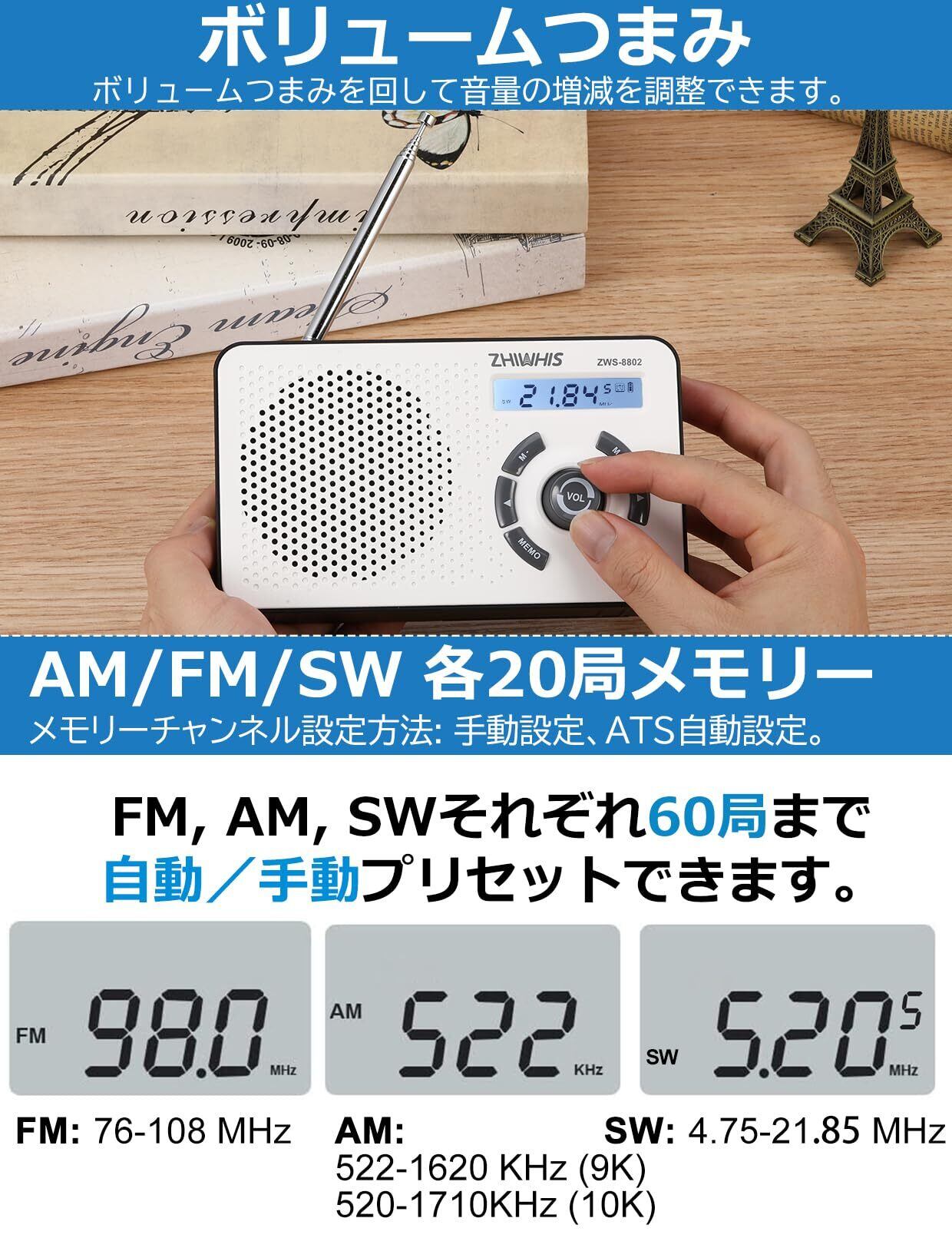 ZHIWHIS デジタルラジオ, AM/FM/短波/ワイドFM対応, 2000mAhリチウム電池内蔵, デジタル時計・目覚まし機能付き, 乾電池使用可能, ポータブルDSP高感度, 防災用, 2026新登場ZWS-8802