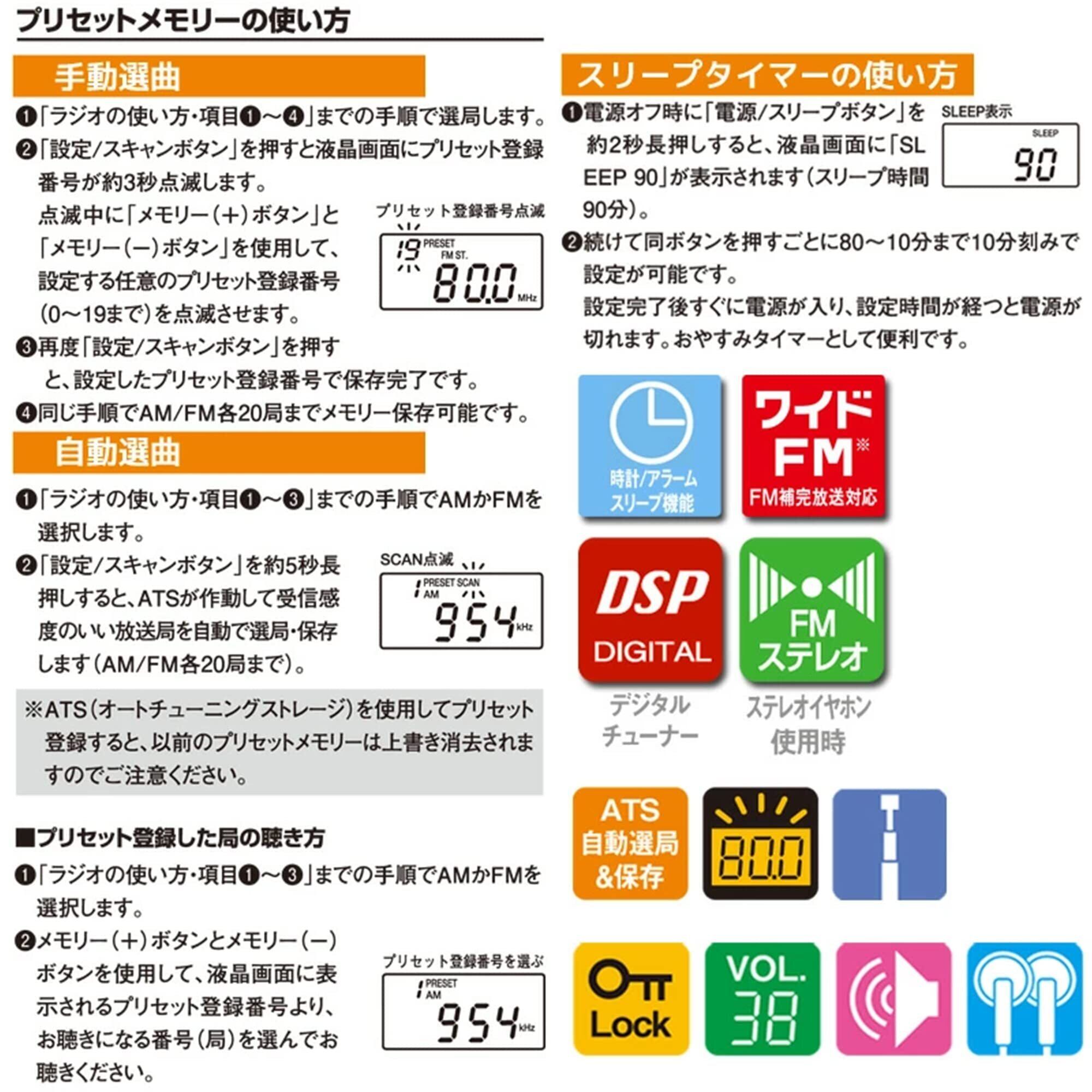 【 特 長 】● ポケットに入る! 通勤に便利な薄型ラジオ● 高感度でクリアなデジタルチューナー搭載● 暗い場所でも見やすい照明付液晶ディスプレイ。音量もデジタル表示● AM/FM各20局を自動でメモリーできる自動選局&保存機能付● 時計・アラーム・スリープ機能付● ワイドFM対応● FMロッドアンテナ付● 誤作動防止ロック機能付● スピーカー搭載・ステレオイヤホン付属