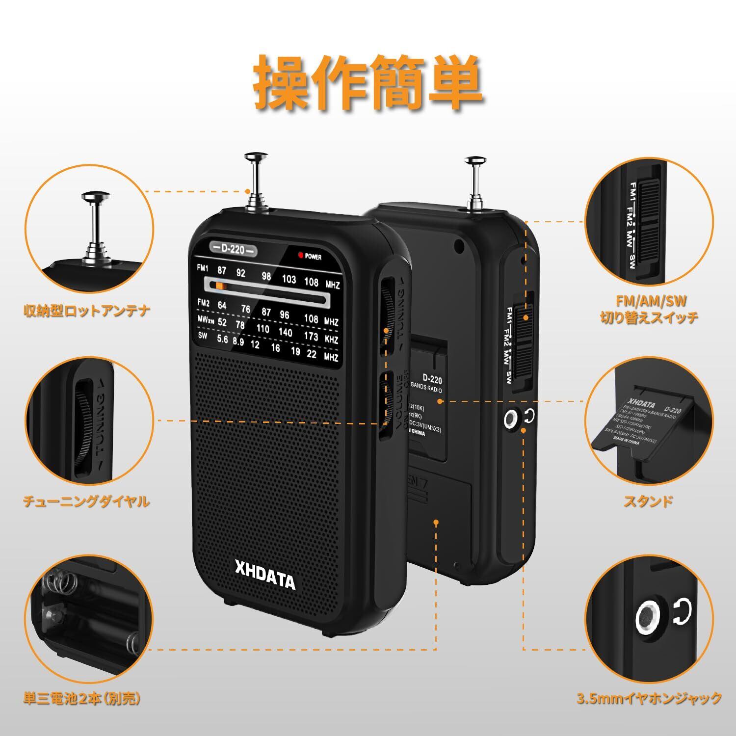 「単三電池使用」XHDATA D220携帯ラジオは単三電池2本を使用します。普通の音量で長時間を使用できます。簡単に交換できる電池型で、交換用電池を備えば、停電や外出に電源切れを心配いりません。(電池は別売で、付属されていないのでご注意ください。)